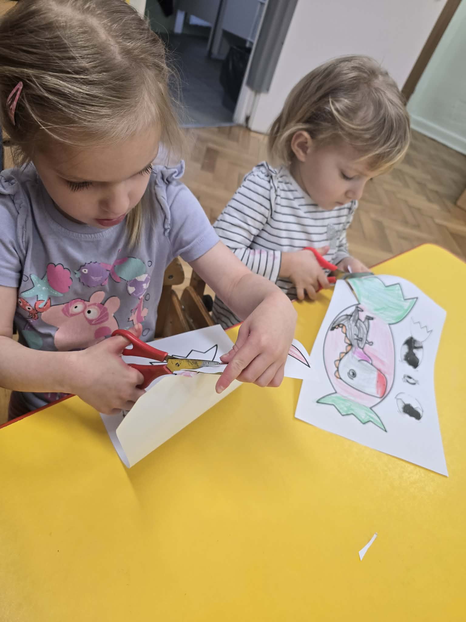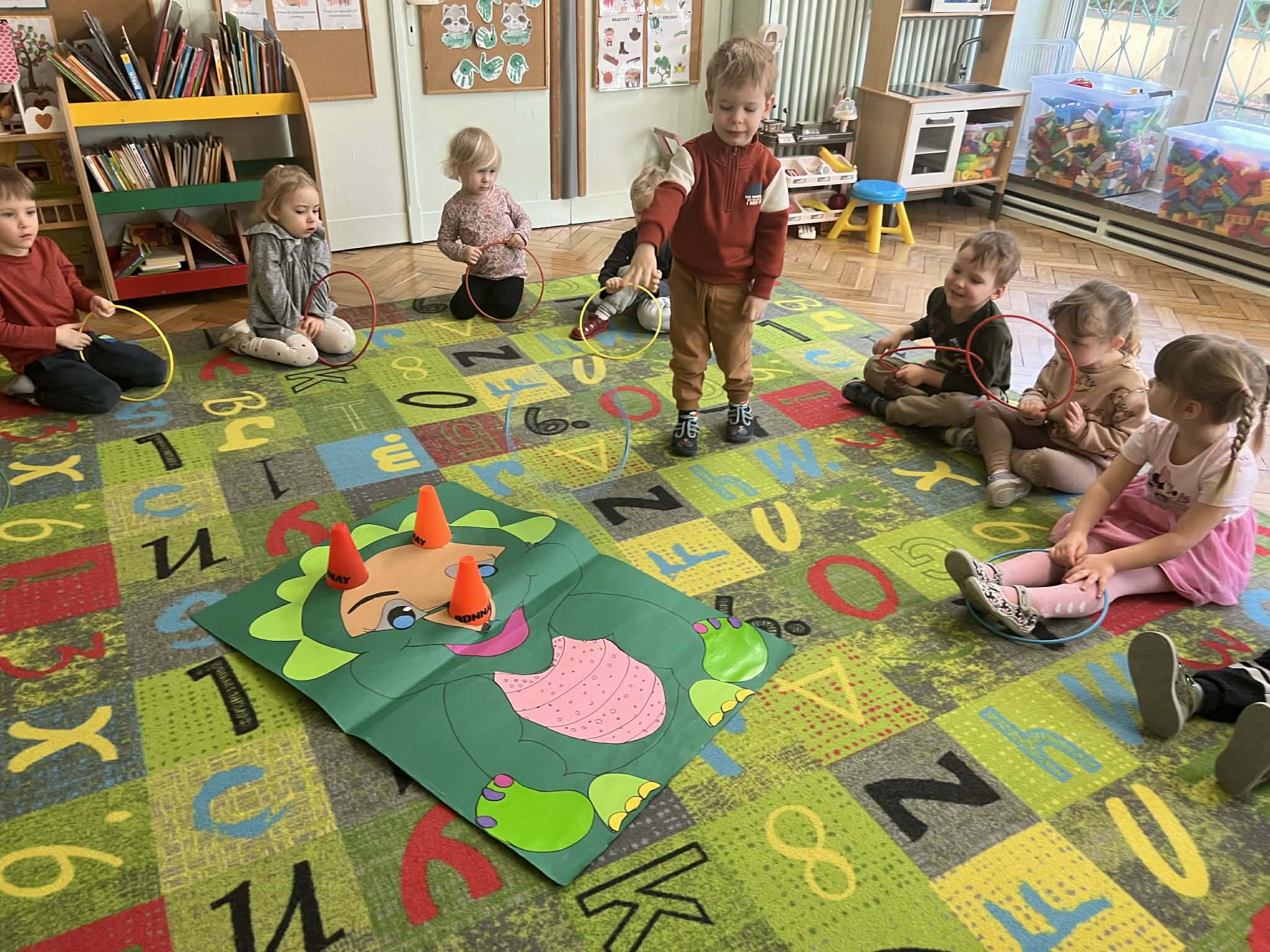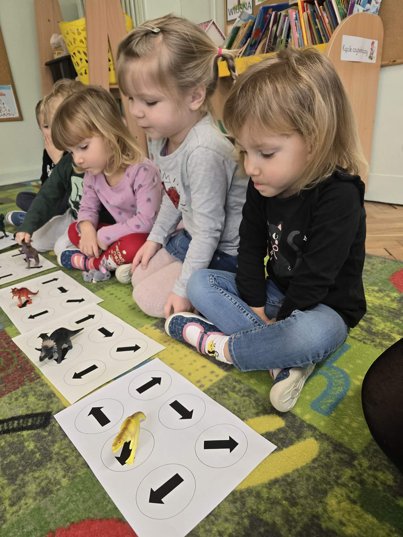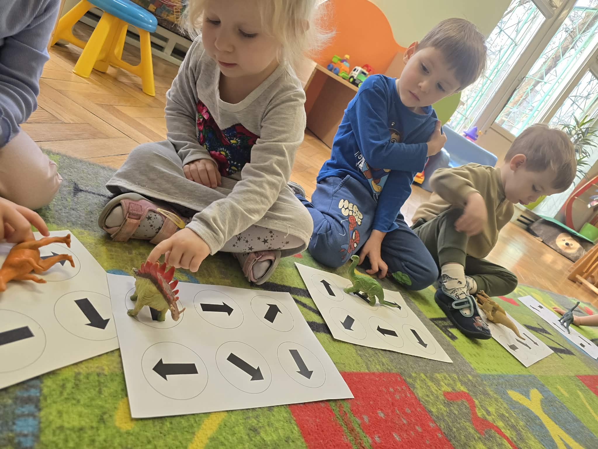 Podczas zajęć dużo tworzyliśmy – kolorowaliśmy ilustracje dinozaurów, wycinaliśmy oraz przygotowywaliśmy własne prace plastyczne. Ćwiczyliśmy także kierunki przestrzenne, określając, gdzie znajduje się dinozaur.
