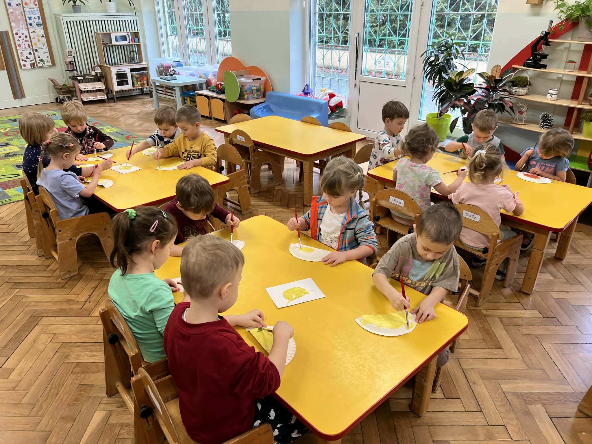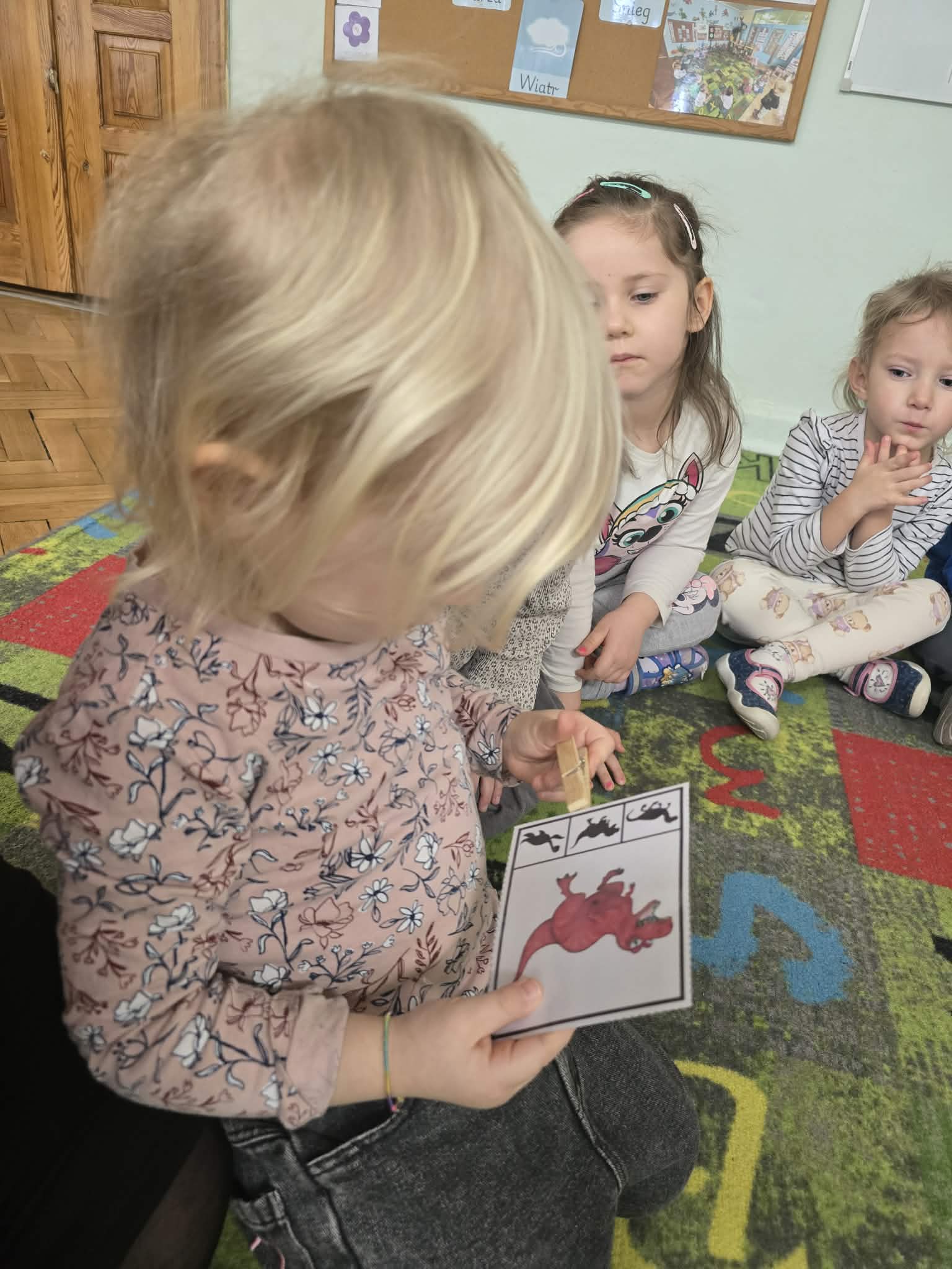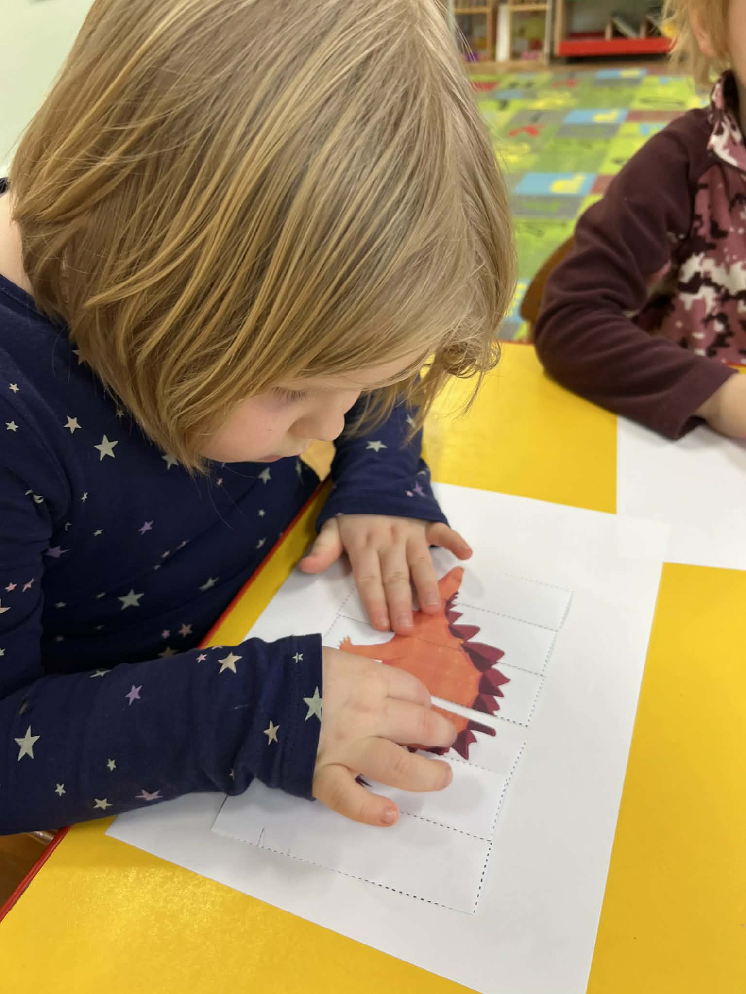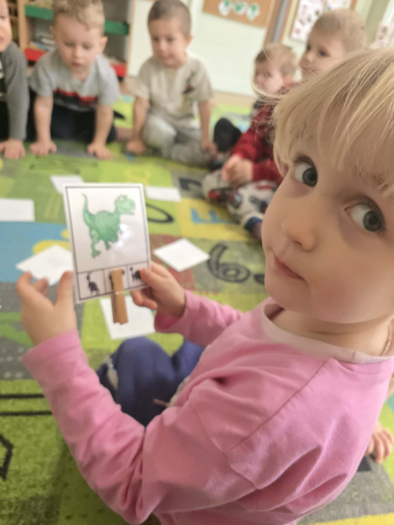 Podczas zajęć dużo tworzyliśmy – kolorowaliśmy ilustracje dinozaurów, wycinaliśmy oraz przygotowywaliśmy własne prace plastyczne. Ćwiczyliśmy także kierunki przestrzenne, określając, gdzie znajduje się dinozaur.