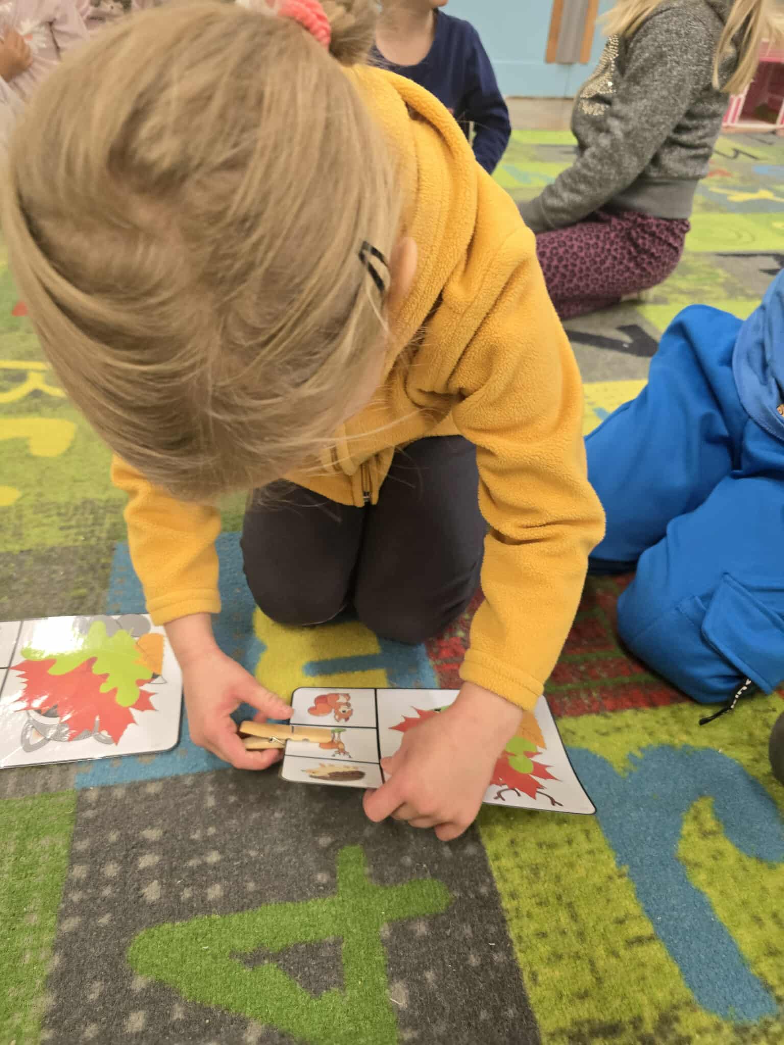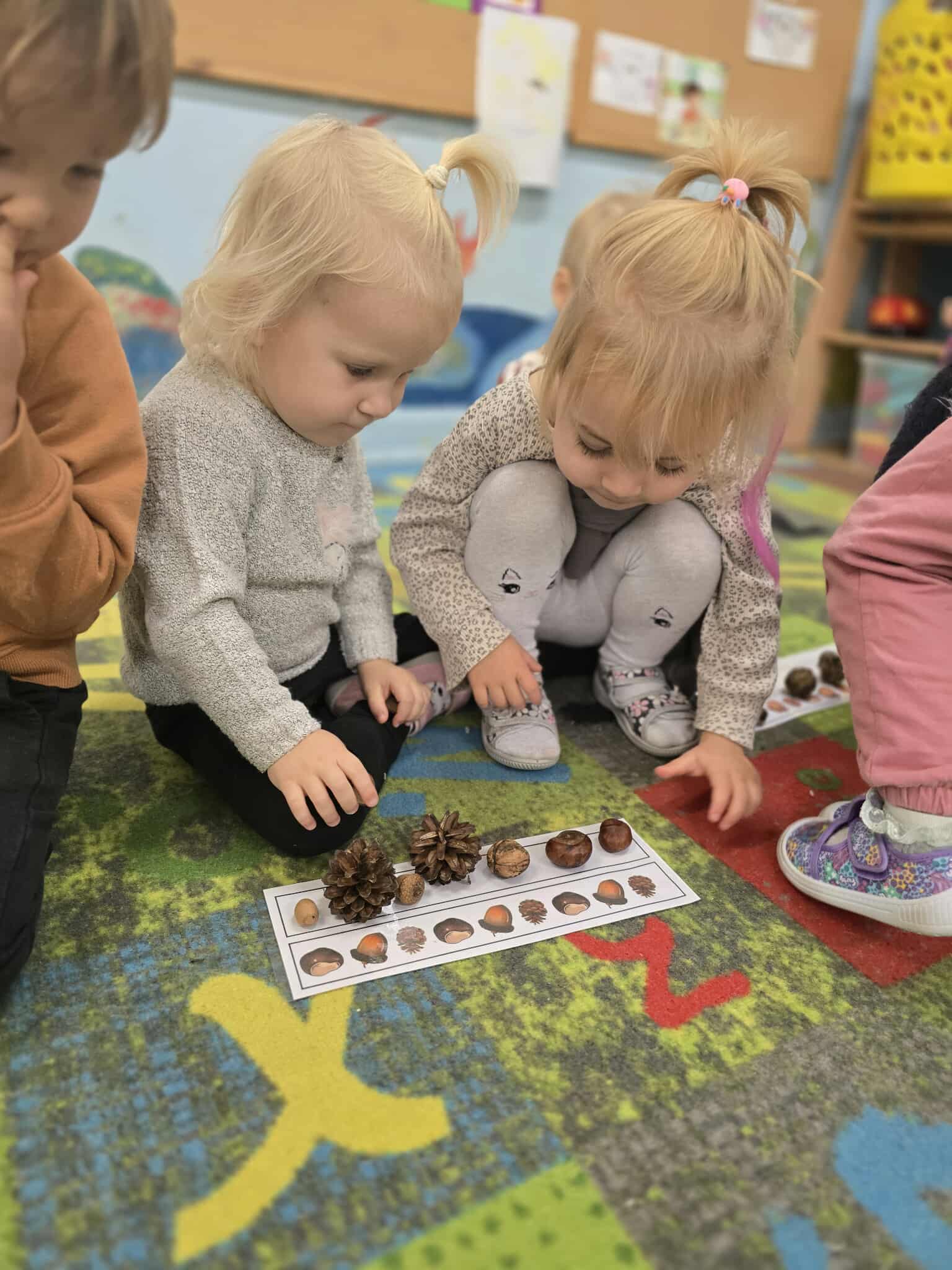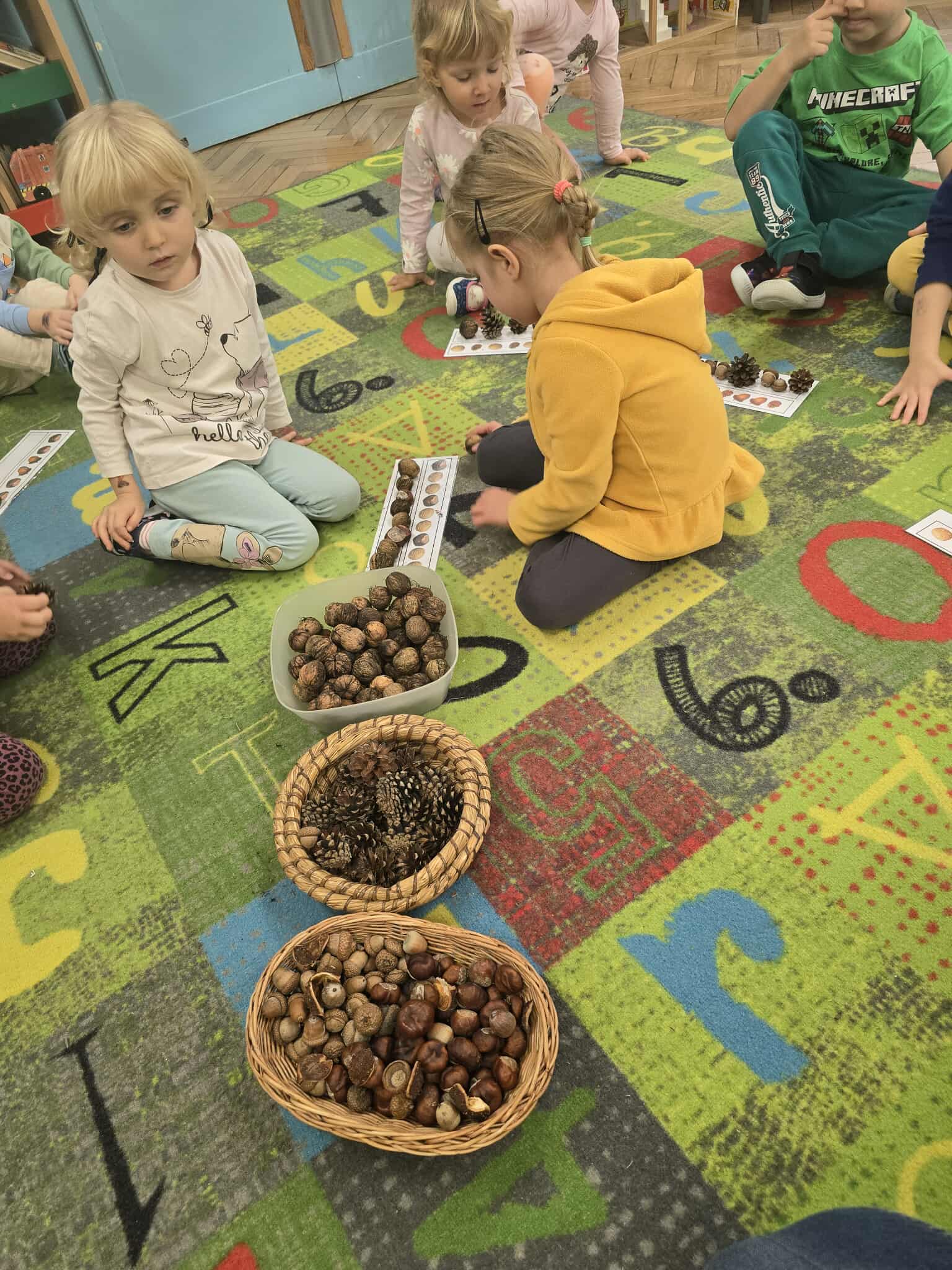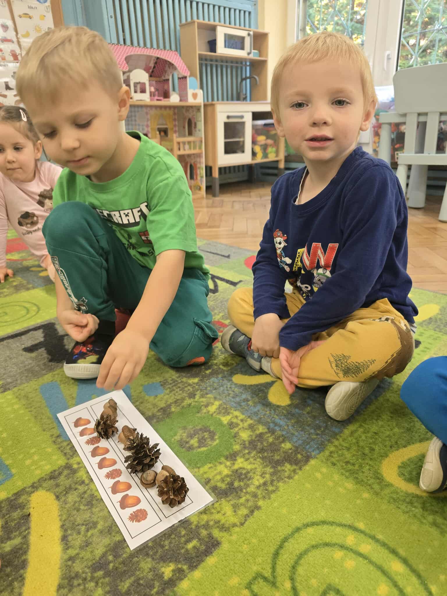 Zgromadzone skarby posłużyły podczas kolejnych zajęć.Dzieci układały rytmy według wzoru z wykorzystaniem darów jesieni, doskonaląc spostrzegawczość i logiczne myślenie. Ćwiczyły również sprawność dłoni poprzez zabawy ze spinaczami, które pomagały rozwijać motorykę małą.