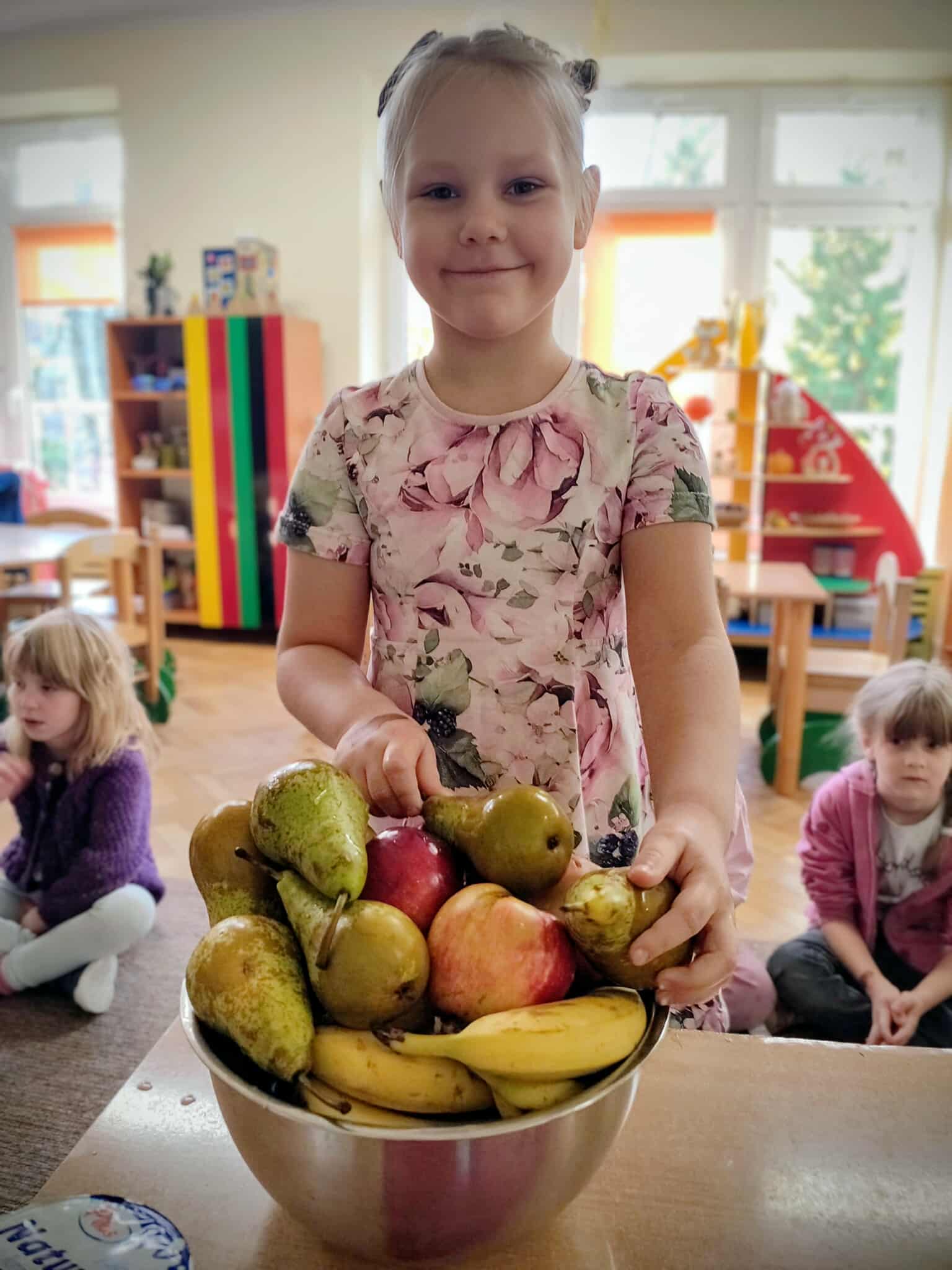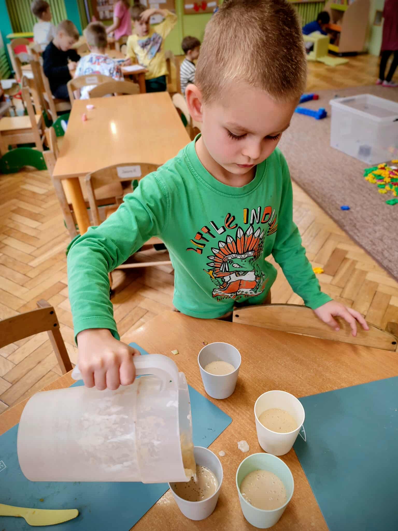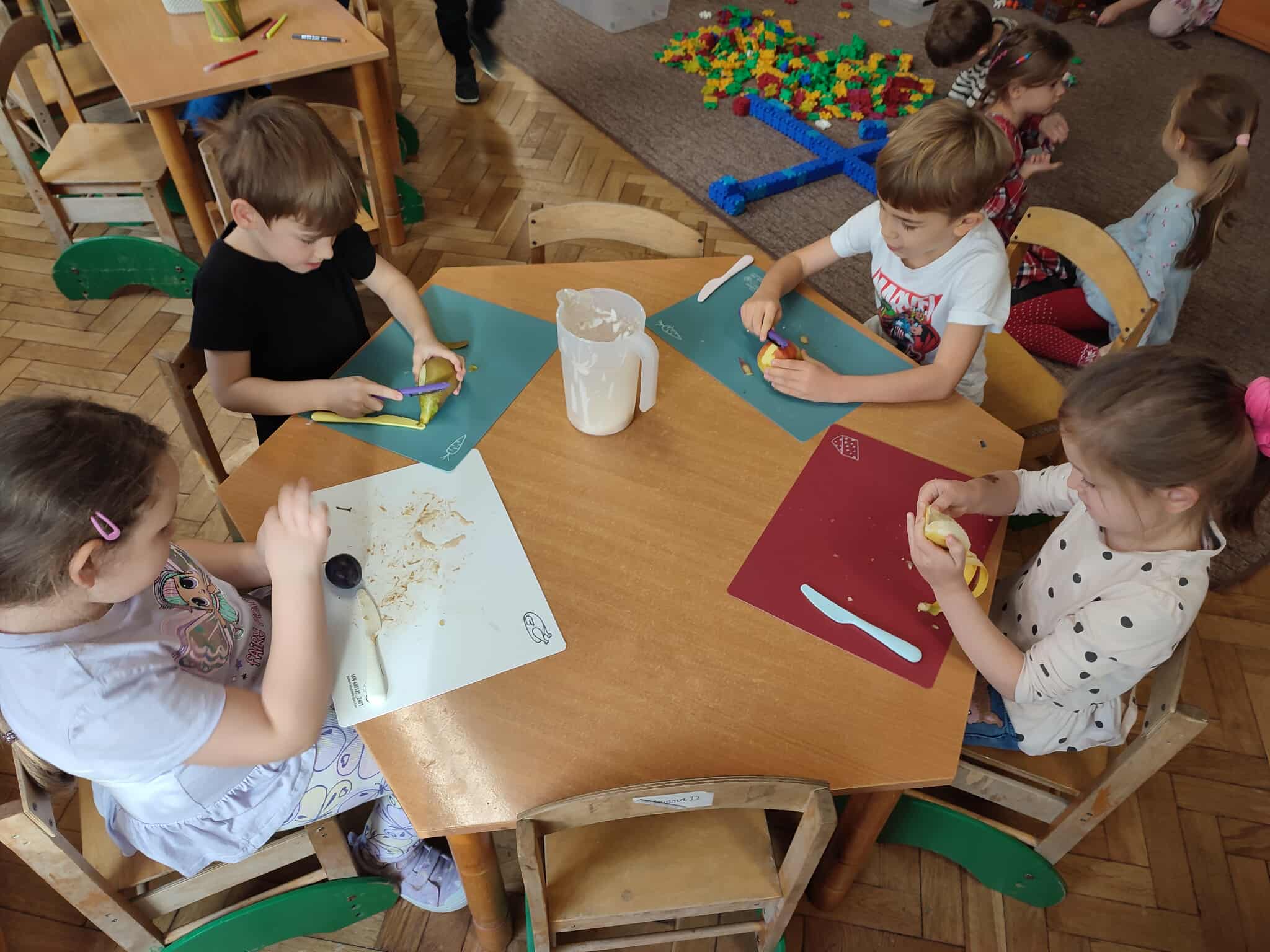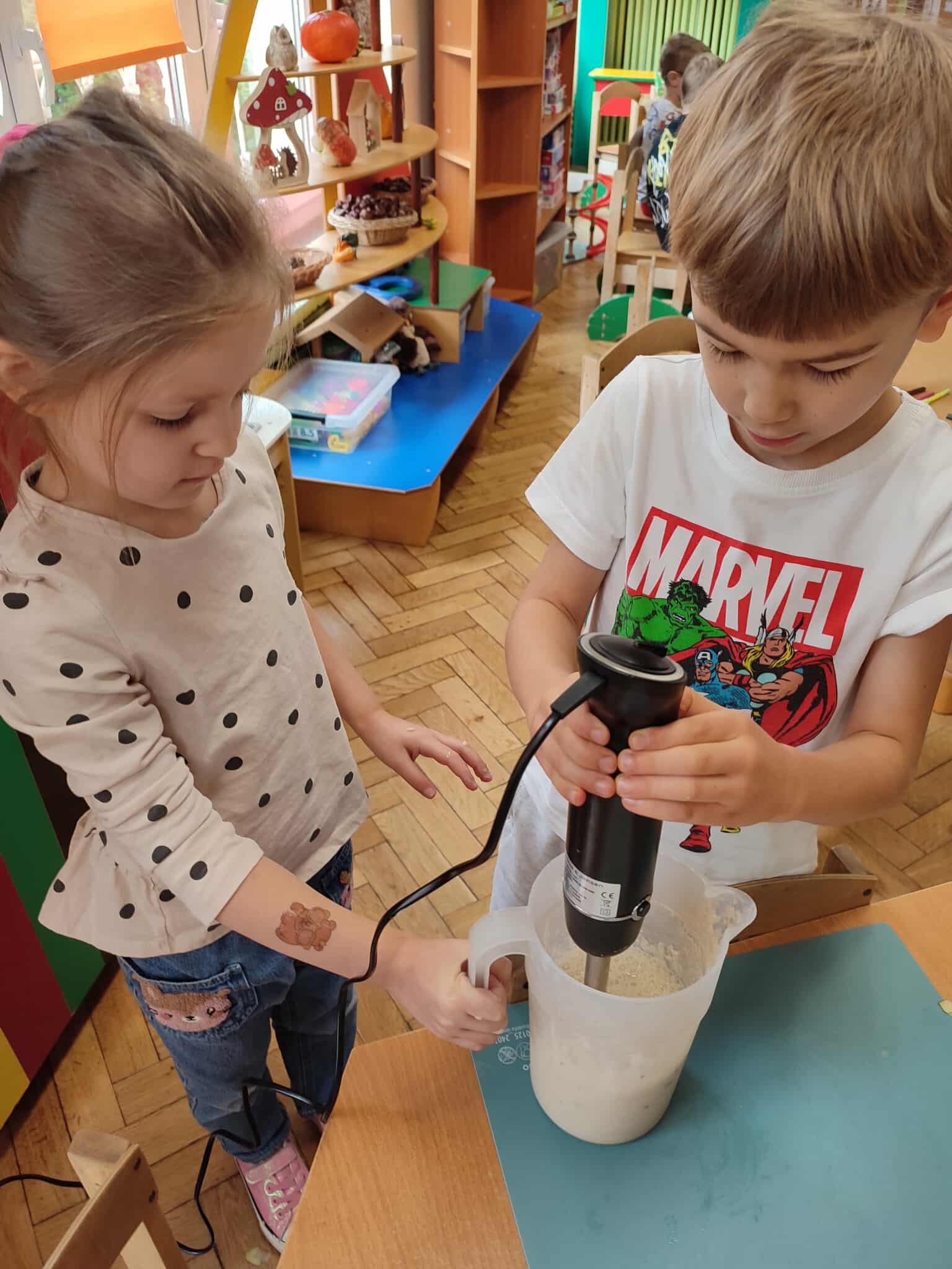 We wtorek w naszej sali unosiły się pyszne zapachy jabłek, gruszek i śliwek – a wszystko za sprawą jesiennego smoothie, które sami przygotowaliśmy. Najpierw dokładnie umyliśmy owoce, potem – z dużym skupieniem i ostrożnością – obraliśmy je i pokroiliśmy na kawałki. Następnie dorzuciliśmy jogurt, dodaliśmy trochę wody i wszystko zmiksowaliśmy na gładką, pachnącą masę! Na koniec przyszedł moment najprzyjemniejszy – próbowanie! Smoothie wyszło wyśmienite – słodkie, zdrowe i pełne jesiennych aromatów.