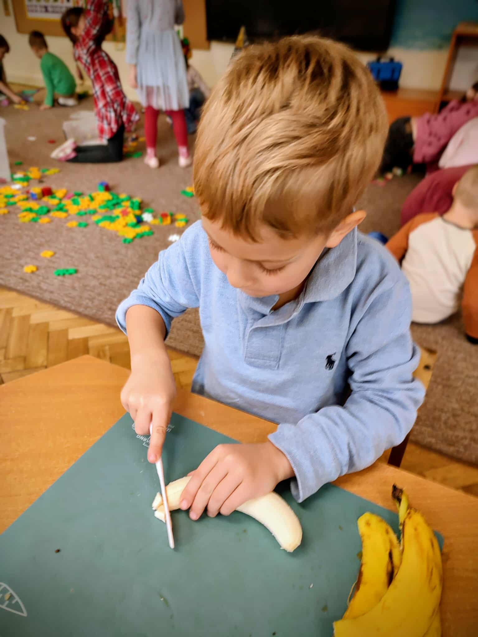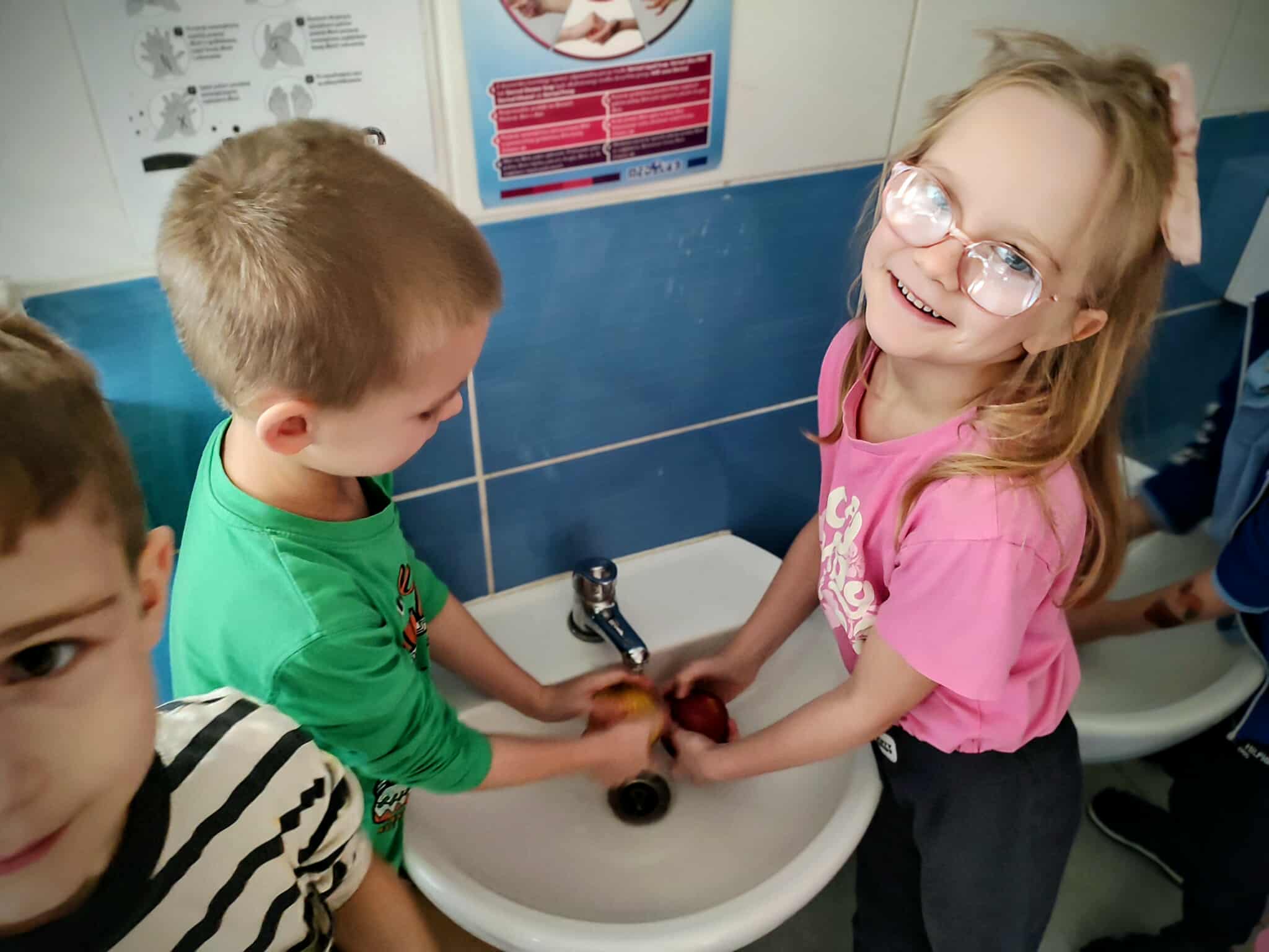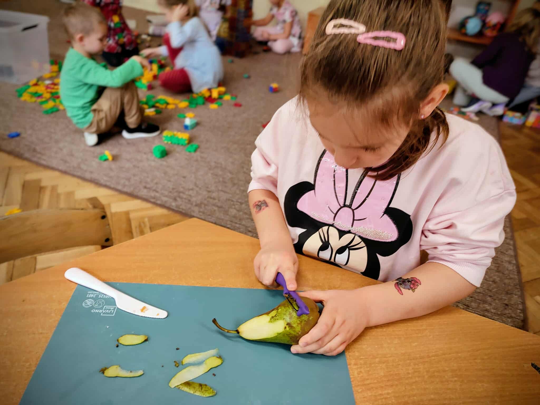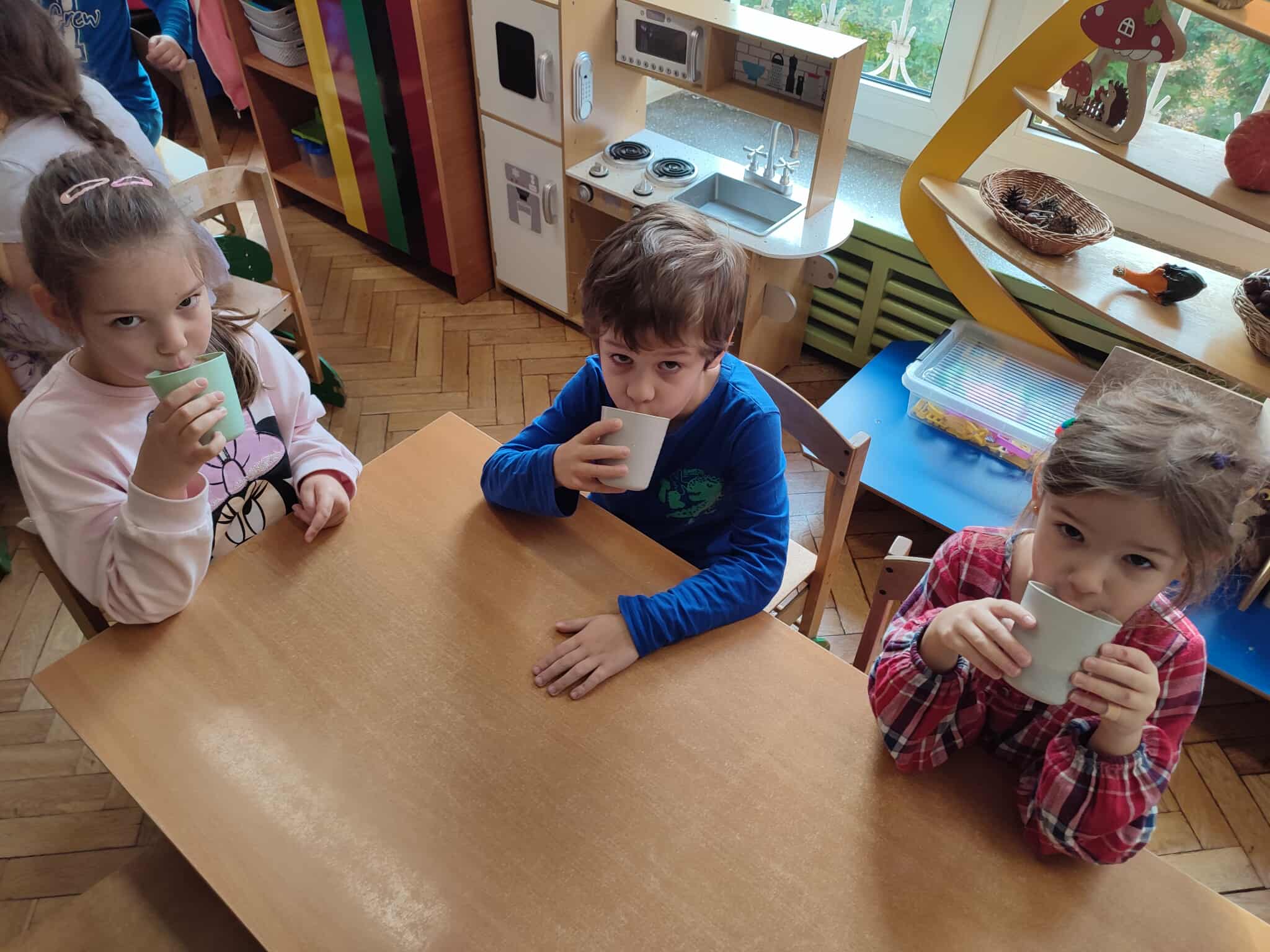 We wtorek w naszej sali unosiły się pyszne zapachy jabłek, gruszek i śliwek – a wszystko za sprawą jesiennego smoothie, które sami przygotowaliśmy. Najpierw dokładnie umyliśmy owoce, potem – z dużym skupieniem i ostrożnością – obraliśmy je i pokroiliśmy na kawałki. Następnie dorzuciliśmy jogurt, dodaliśmy trochę wody i wszystko zmiksowaliśmy na gładką, pachnącą masę! Na koniec przyszedł moment najprzyjemniejszy – próbowanie! Smoothie wyszło wyśmienite – słodkie, zdrowe i pełne jesiennych aromatów.