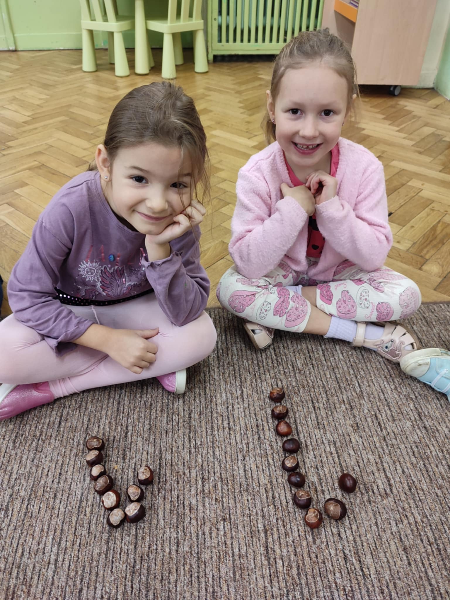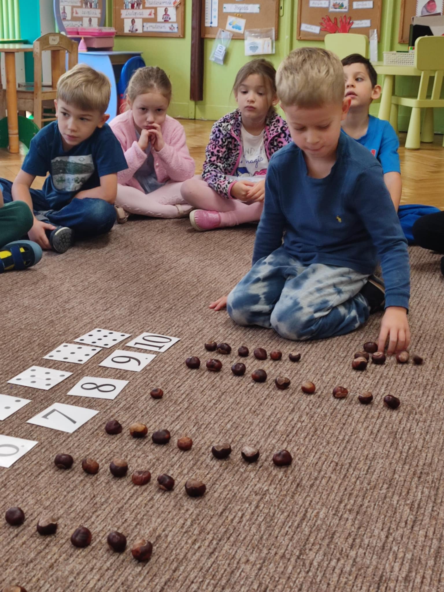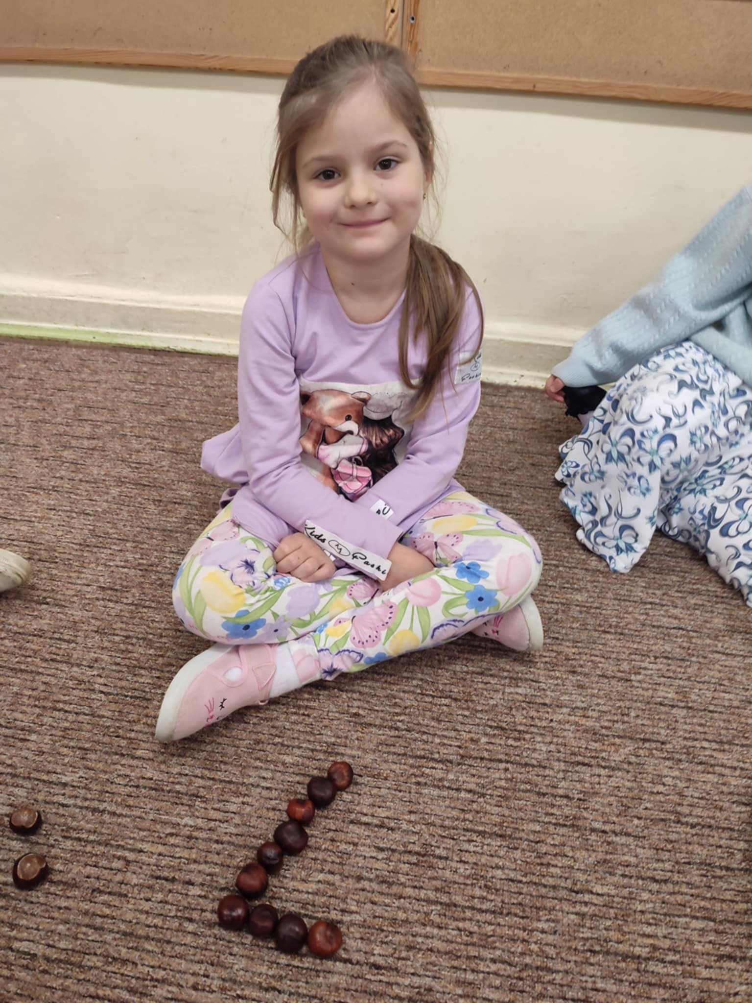 Jesienne dary pomogły nam też w nauce cyfr. Z kasztanów układaliśmy cyfrę 1, a po linii w kształcie 2 stawialiśmy ostrożnie stopy żeby dobrze zapamiętać jej kształt.