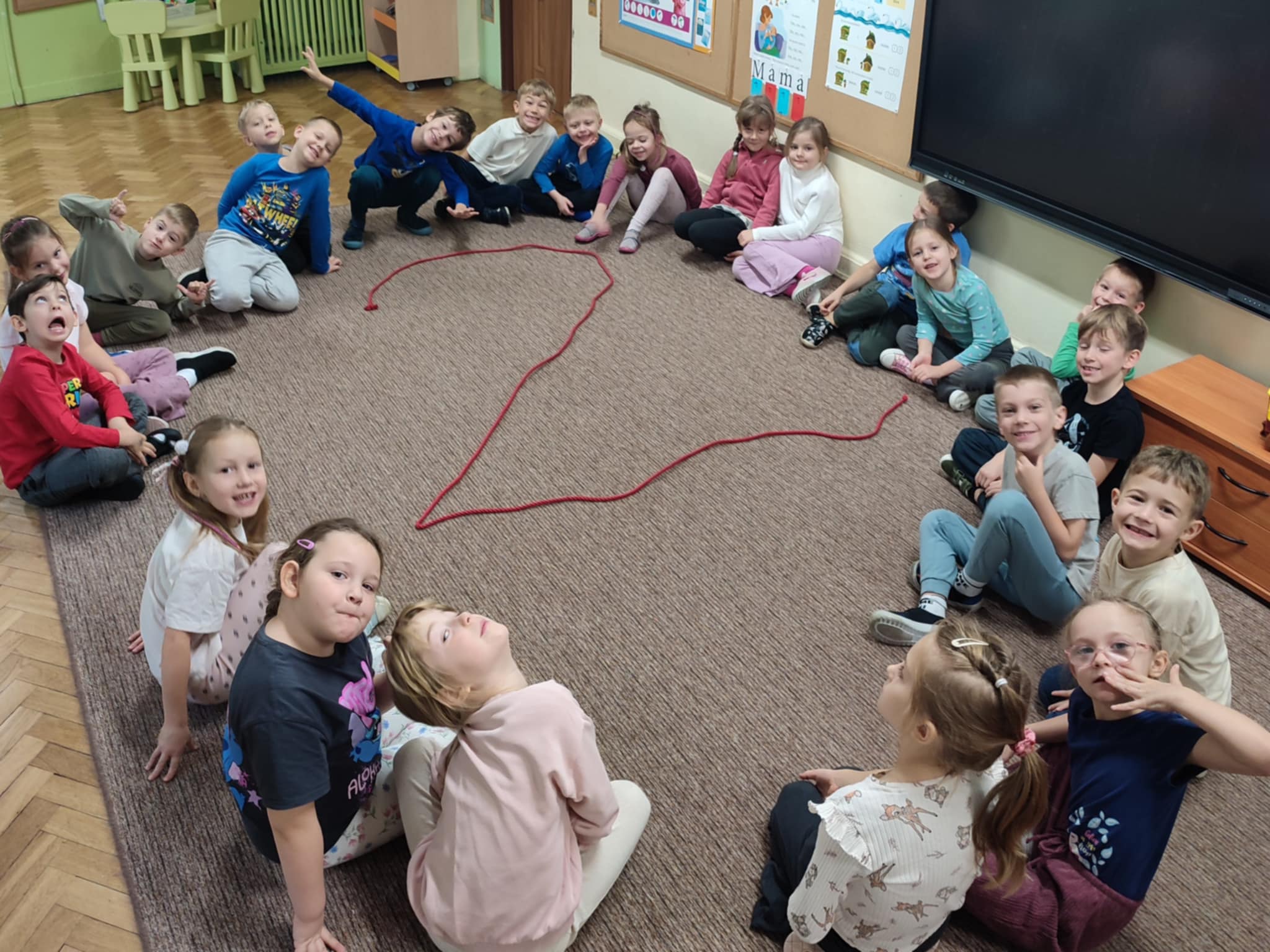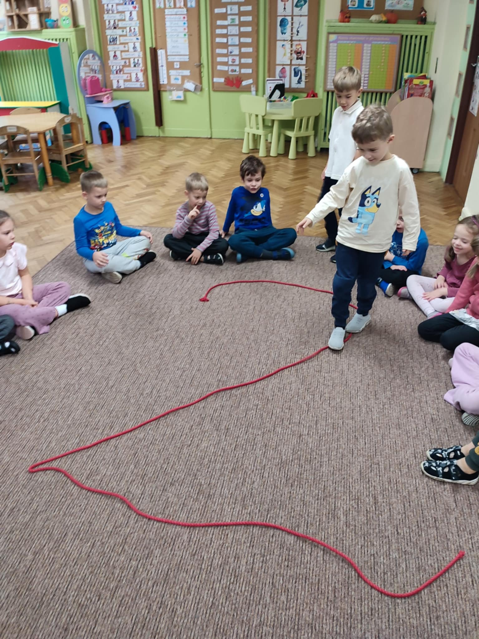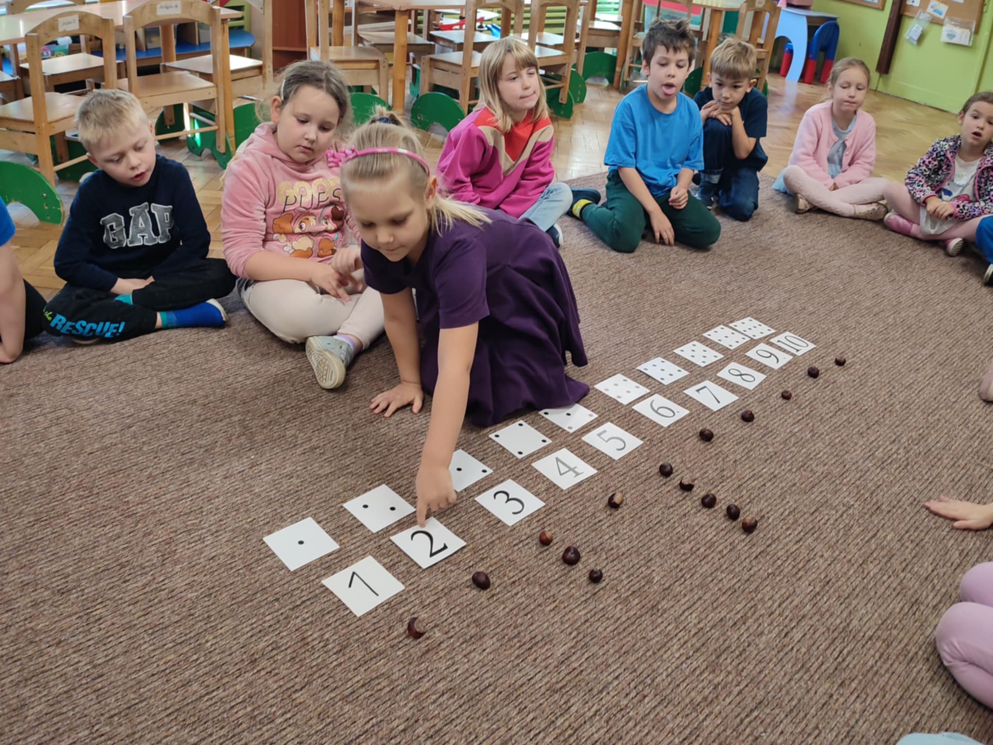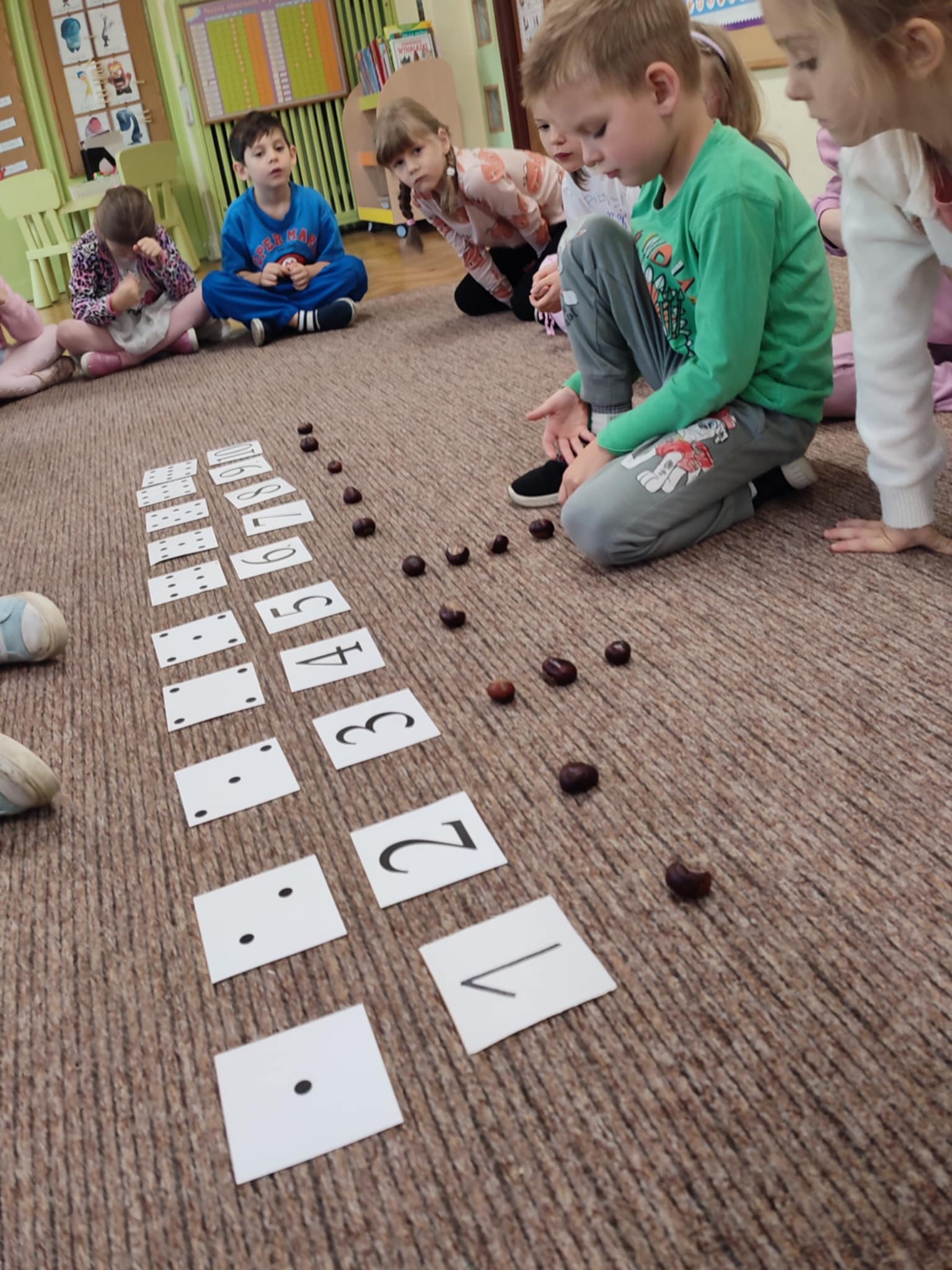 Jesienne dary pomogły nam też w nauce cyfr. Z kasztanów układaliśmy cyfrę 1, a po linii w kształcie 2 stawialiśmy ostrożnie stopy żeby dobrze zapamiętać jej kształt.