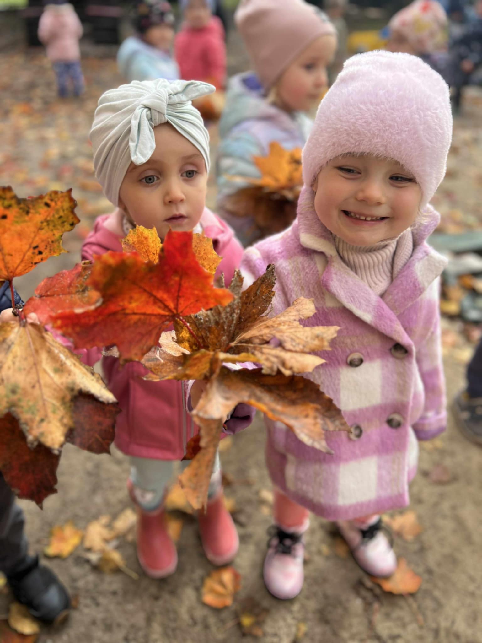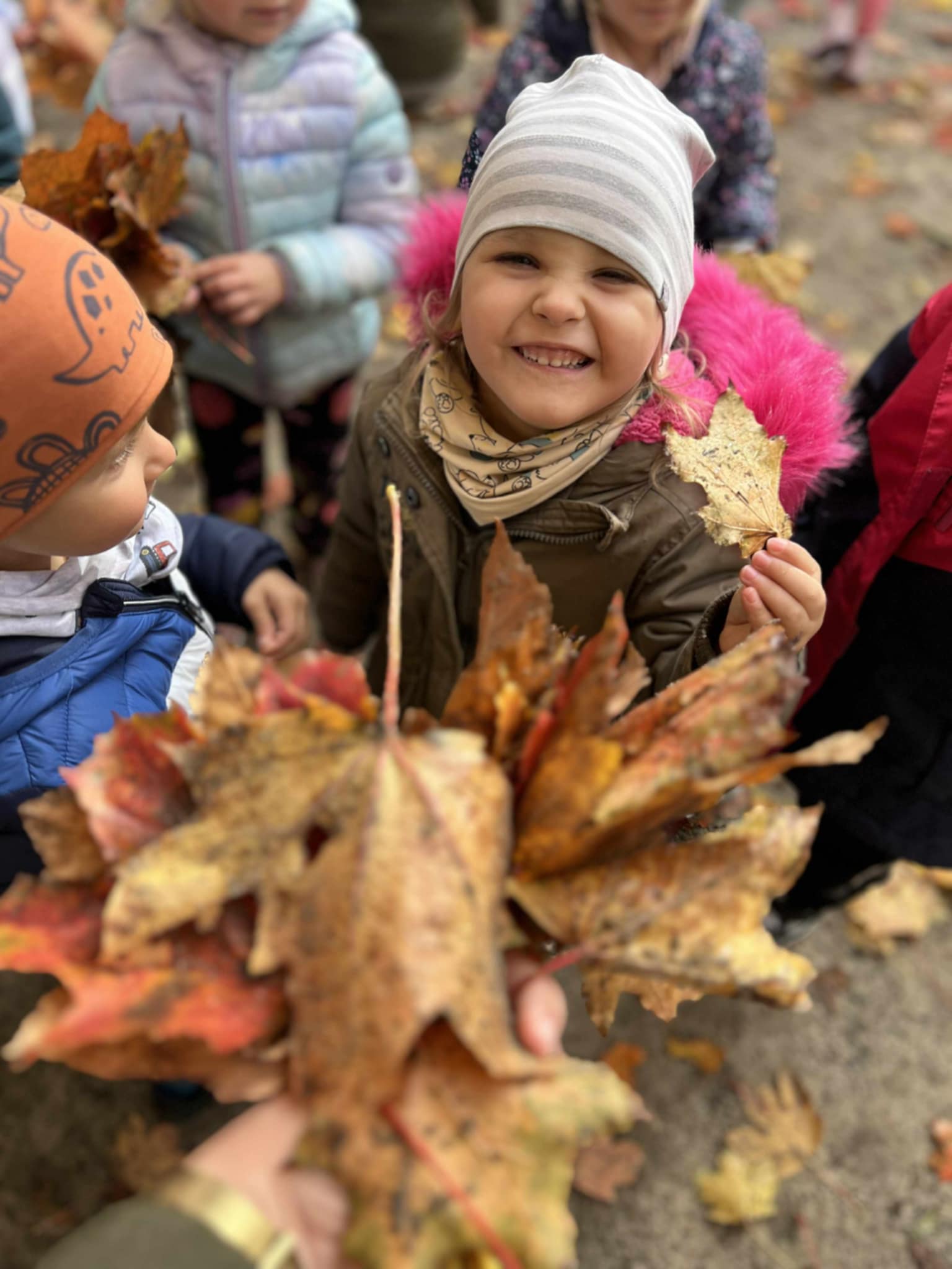 Dzieci zbierały jesienne skarby, z których później tworzyliśmy barwne bukiety i kompozycje z liści. Dzięki temu utrwalaliśmy nazwy kolorów i rozwijaliśmy swoją kreatywność.