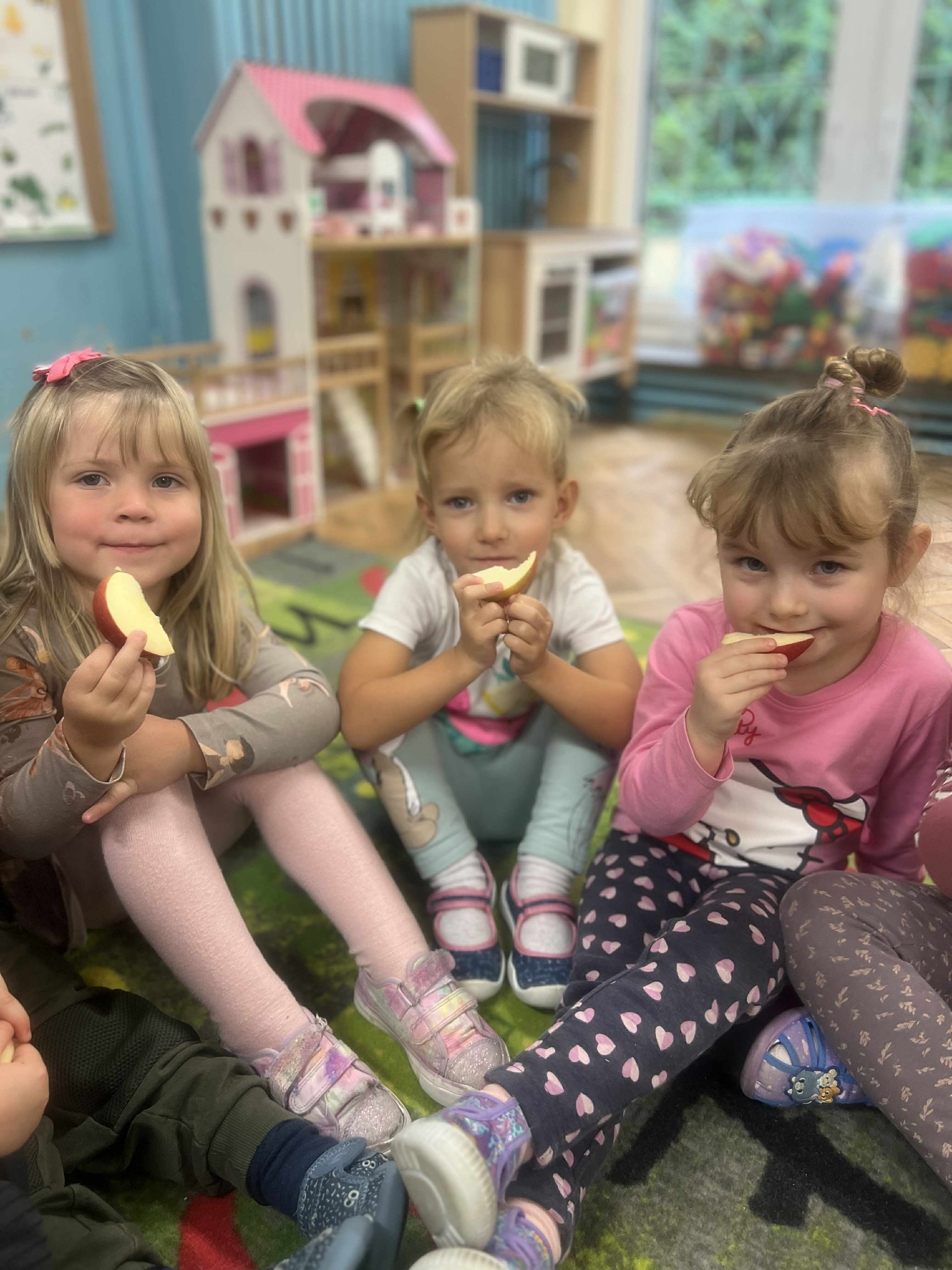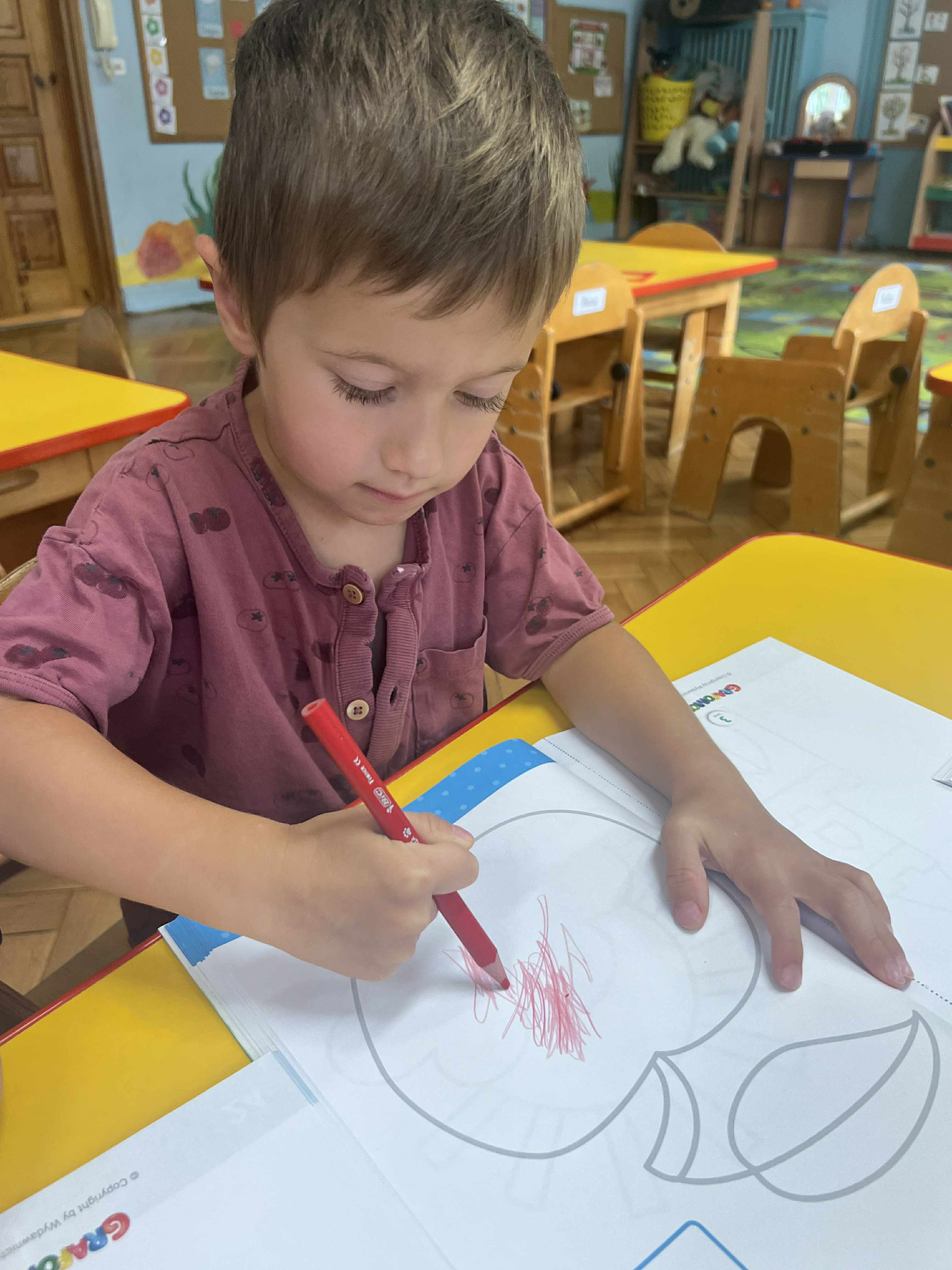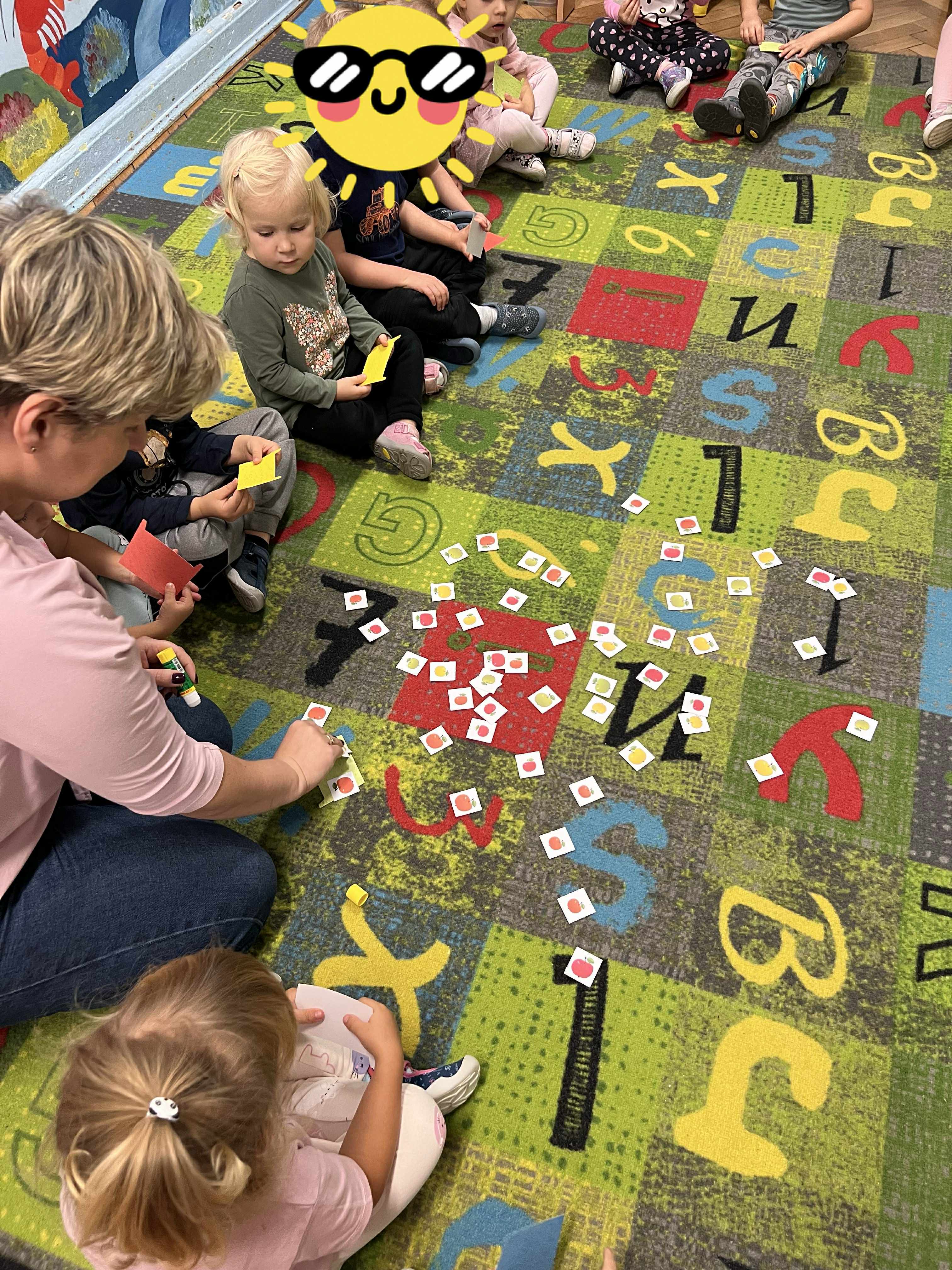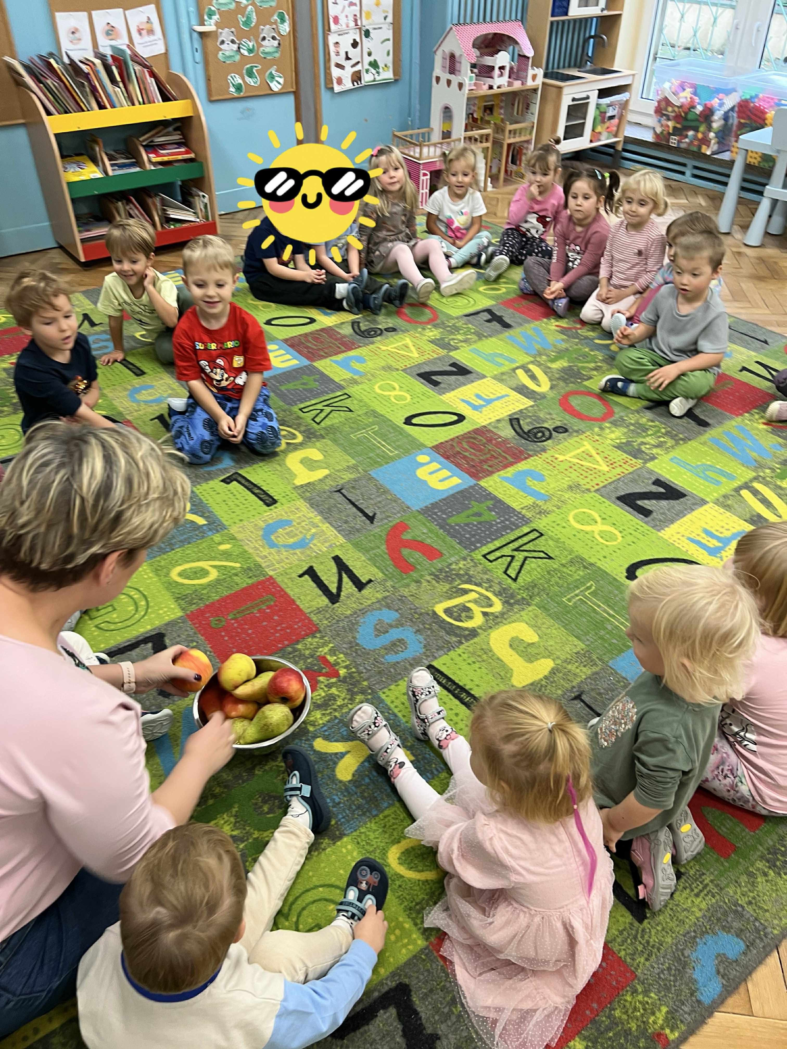 Szopy w dniu dzisiejszym odkrywały właściwości jabłka. Po oglądaniu, porównywaniu wielkości, nadszedł czas na degustacje i rozmowę o witaminach. Następnie po zabawie przy muzyce usiedliśmy " zbierać jabłka w kosze" po 3 każdy a na koniec kolorować jabłko wg podanego wzoru. To był pracowity dzień z Panią Dyrektor