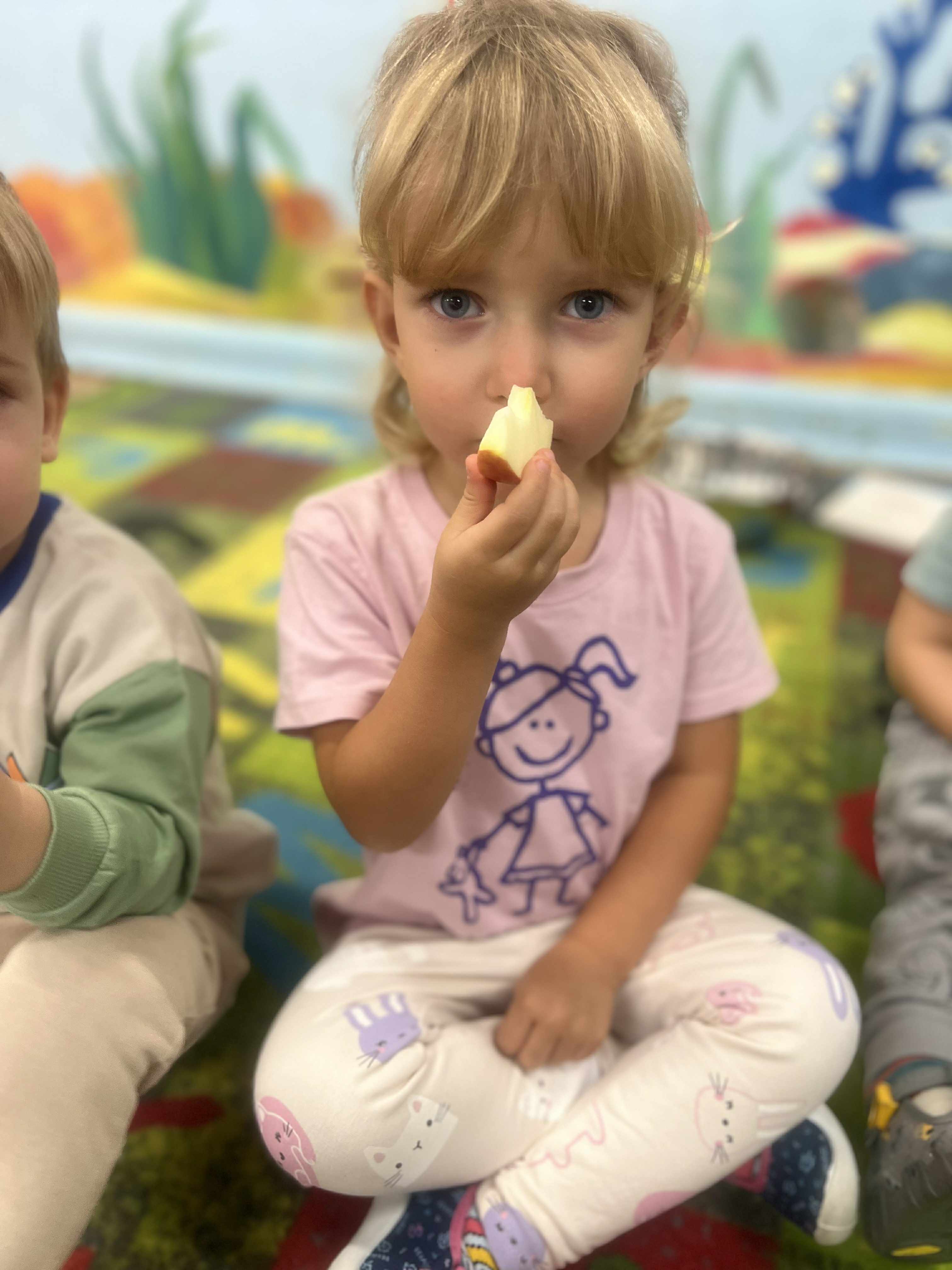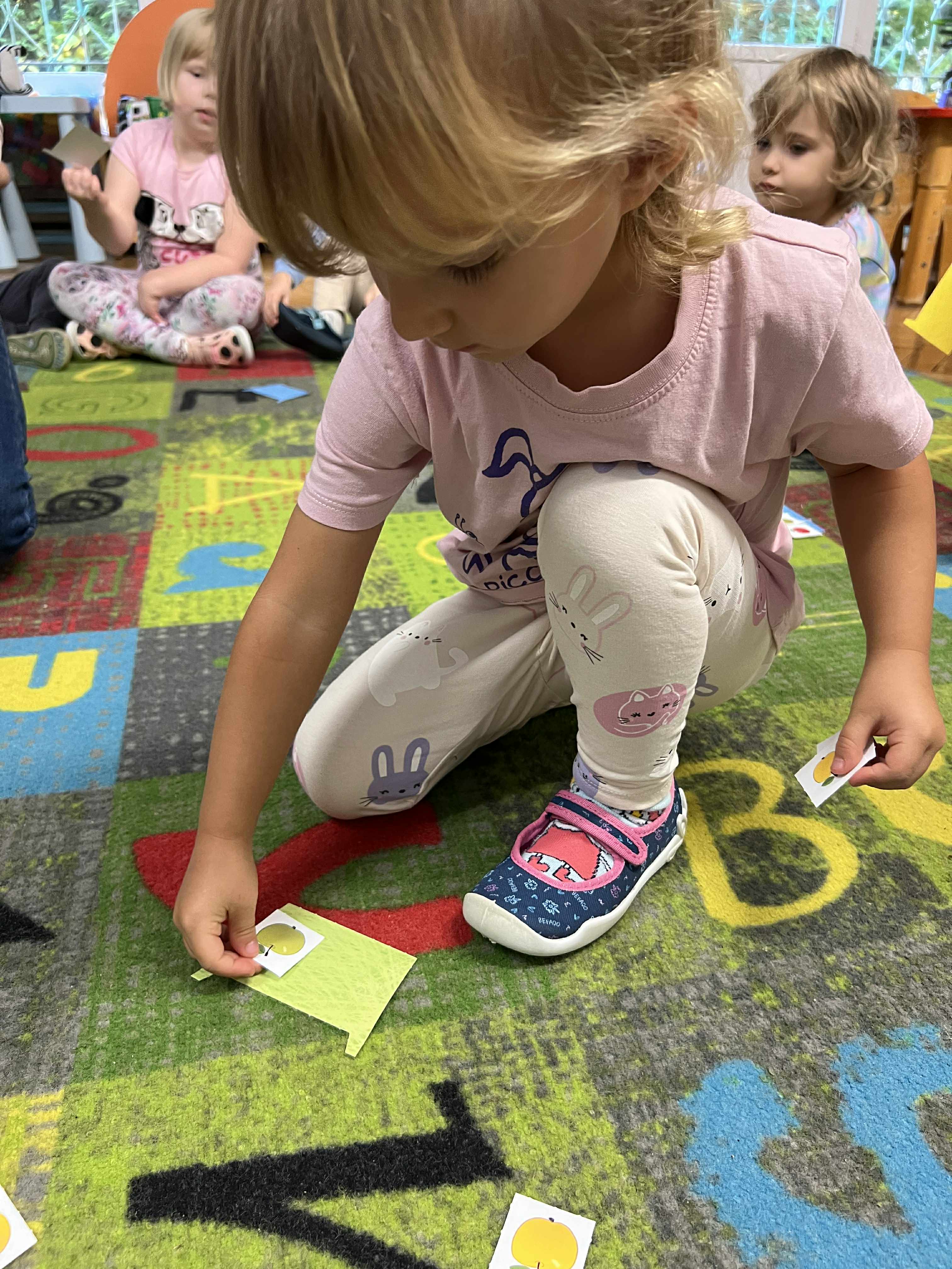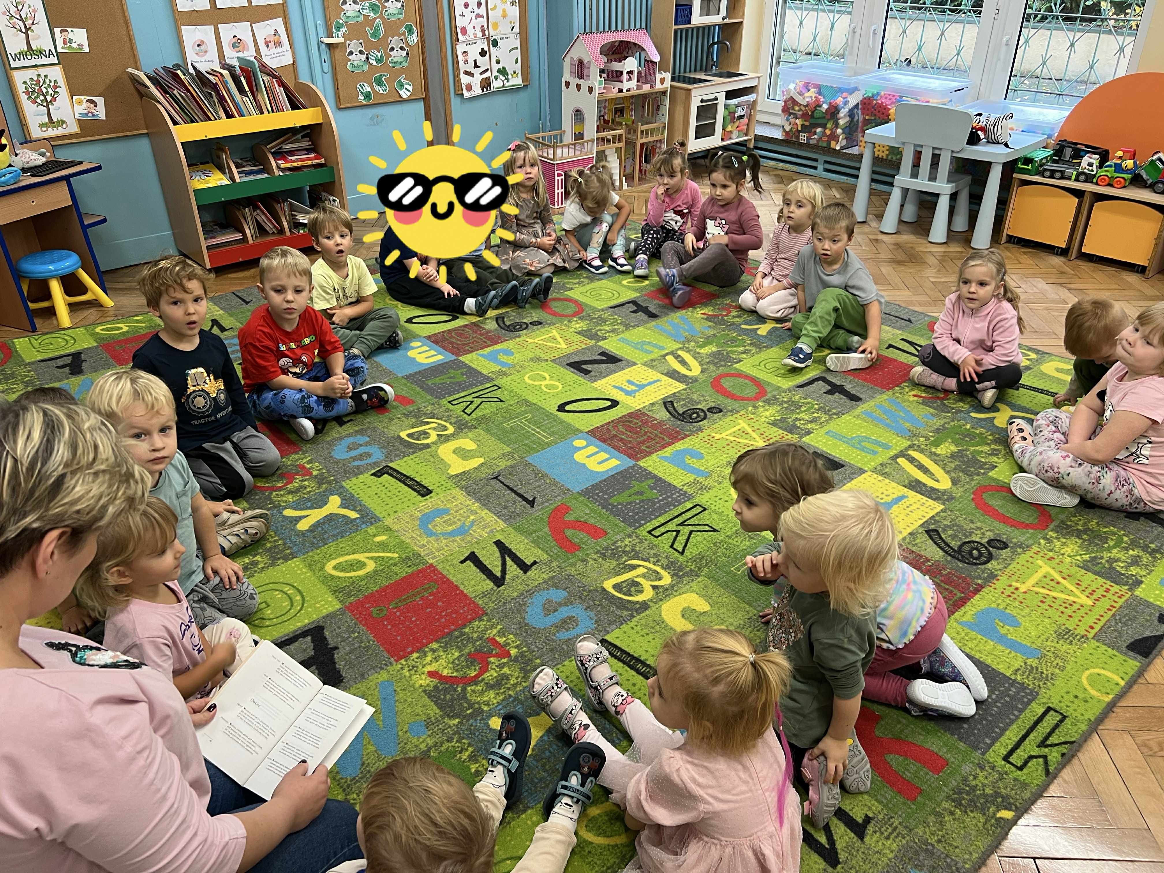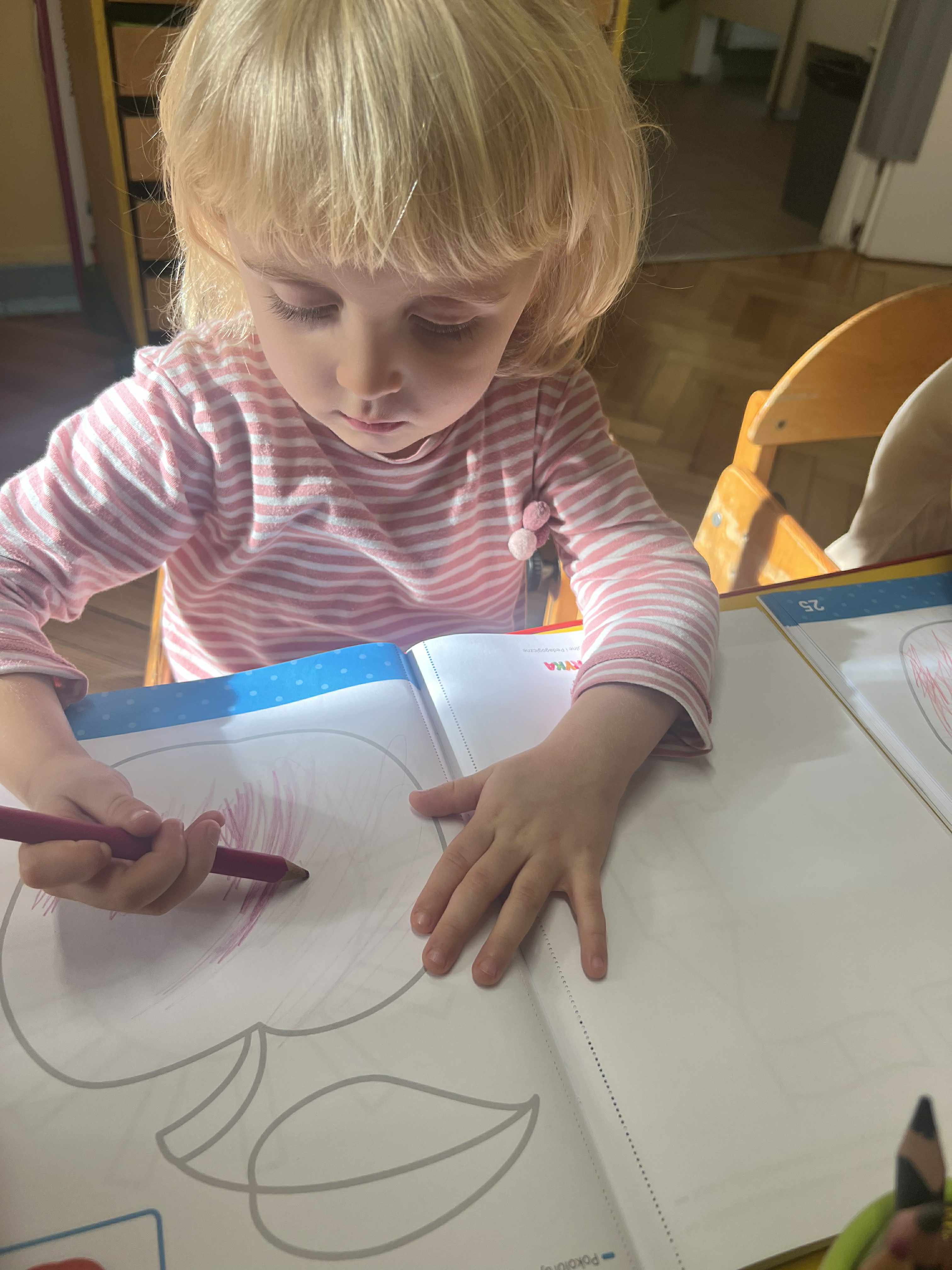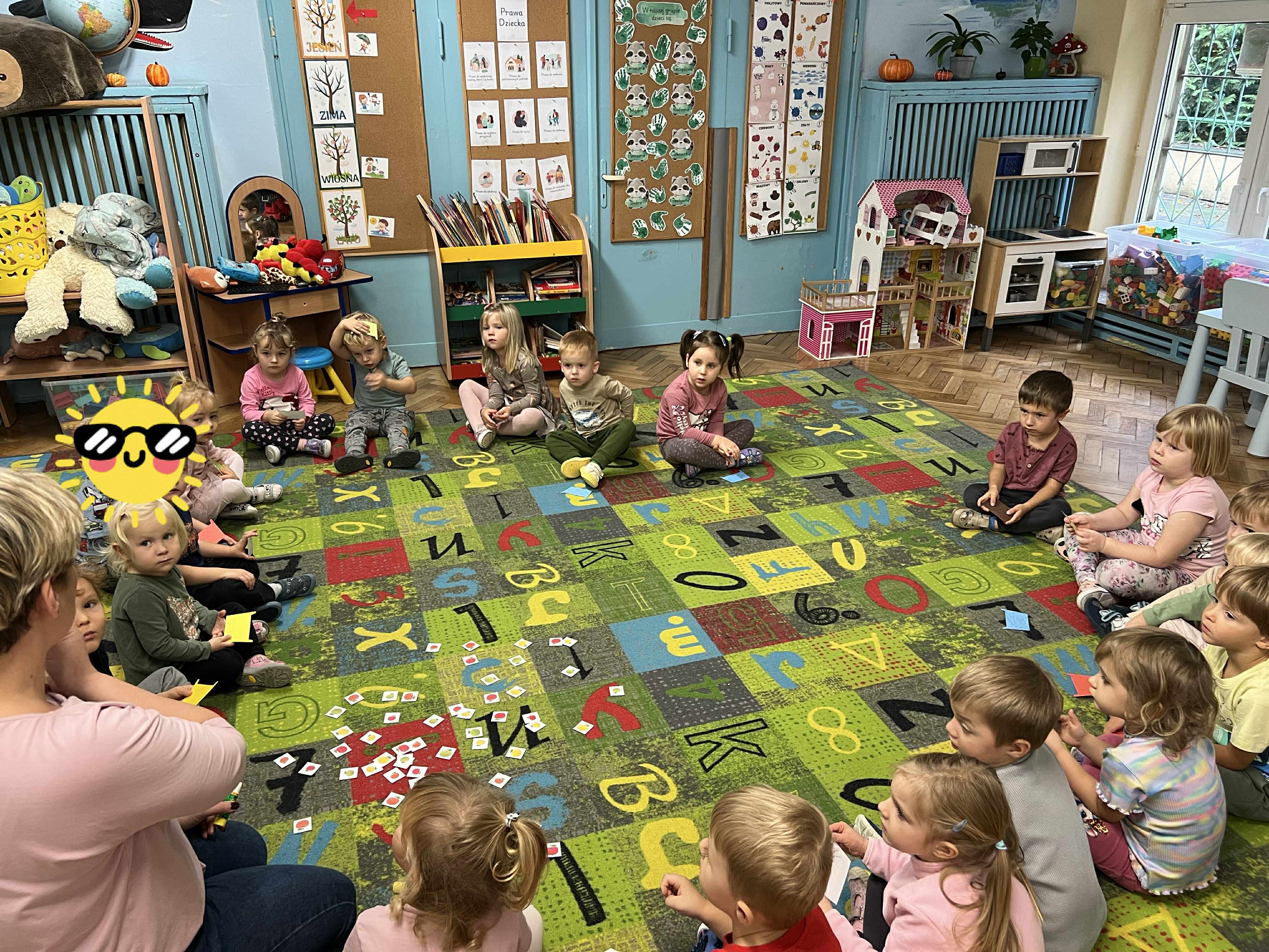 Szopy w dniu dzisiejszym odkrywały właściwości jabłka. Po oglądaniu, porównywaniu wielkości, nadszedł czas na degustacje i rozmowę o witaminach. Następnie po zabawie przy muzyce usiedliśmy " zbierać jabłka w kosze" po 3 każdy a na koniec kolorować jabłko wg podanego wzoru. To był pracowity dzień z Panią Dyrektor