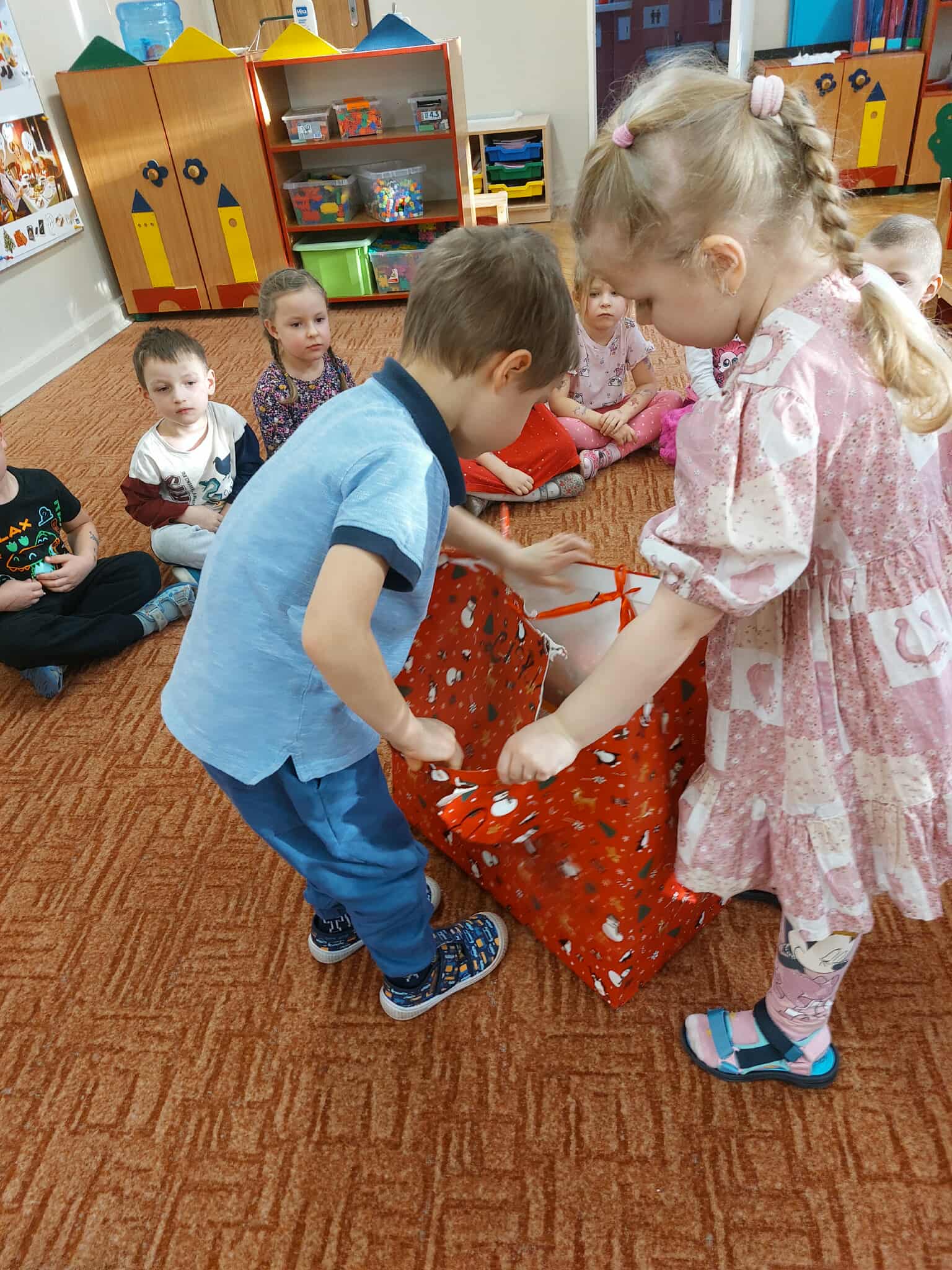 Dzisiejszy dzień był pełen radości i uśmiechów! Po wizycie Świętego Mikołaja grupa Liski otrzymała wspaniałe prezenty, które od razu wywołały ogromny entuzjazm. Wśród niespodzianek znalazły się m.in. kolorowa ciastolina, klocki magnetyczne, drewniane mebelki, autka oraz różnorodne gry.