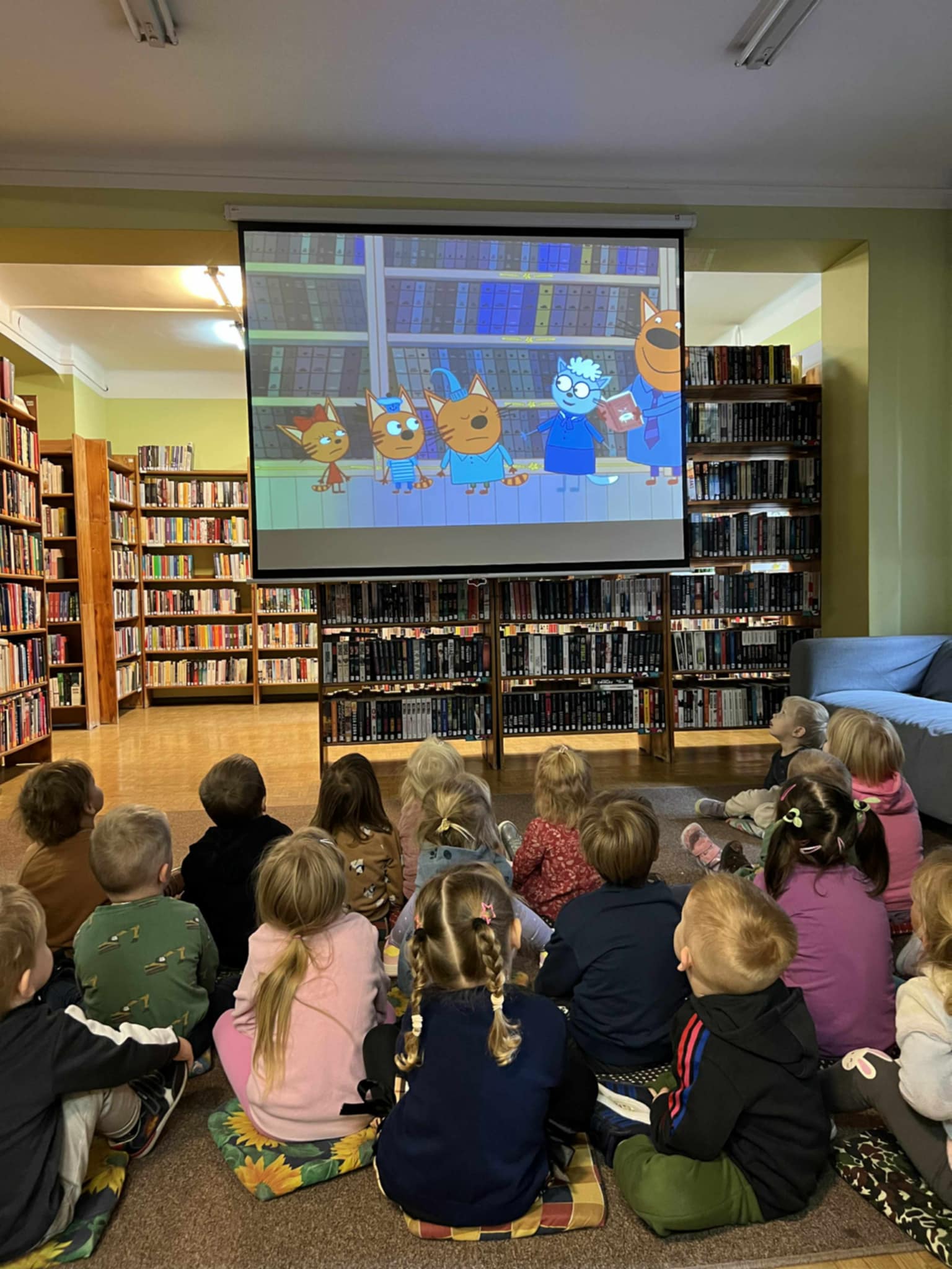 Na zakończenie obejrzeliśmy krótką bajkę o zasadach zachowania w bibliotece. Film w ciekawy i zabawny sposób pokazał, że w bibliotece należy zachowywać ciszę, szanować książki.