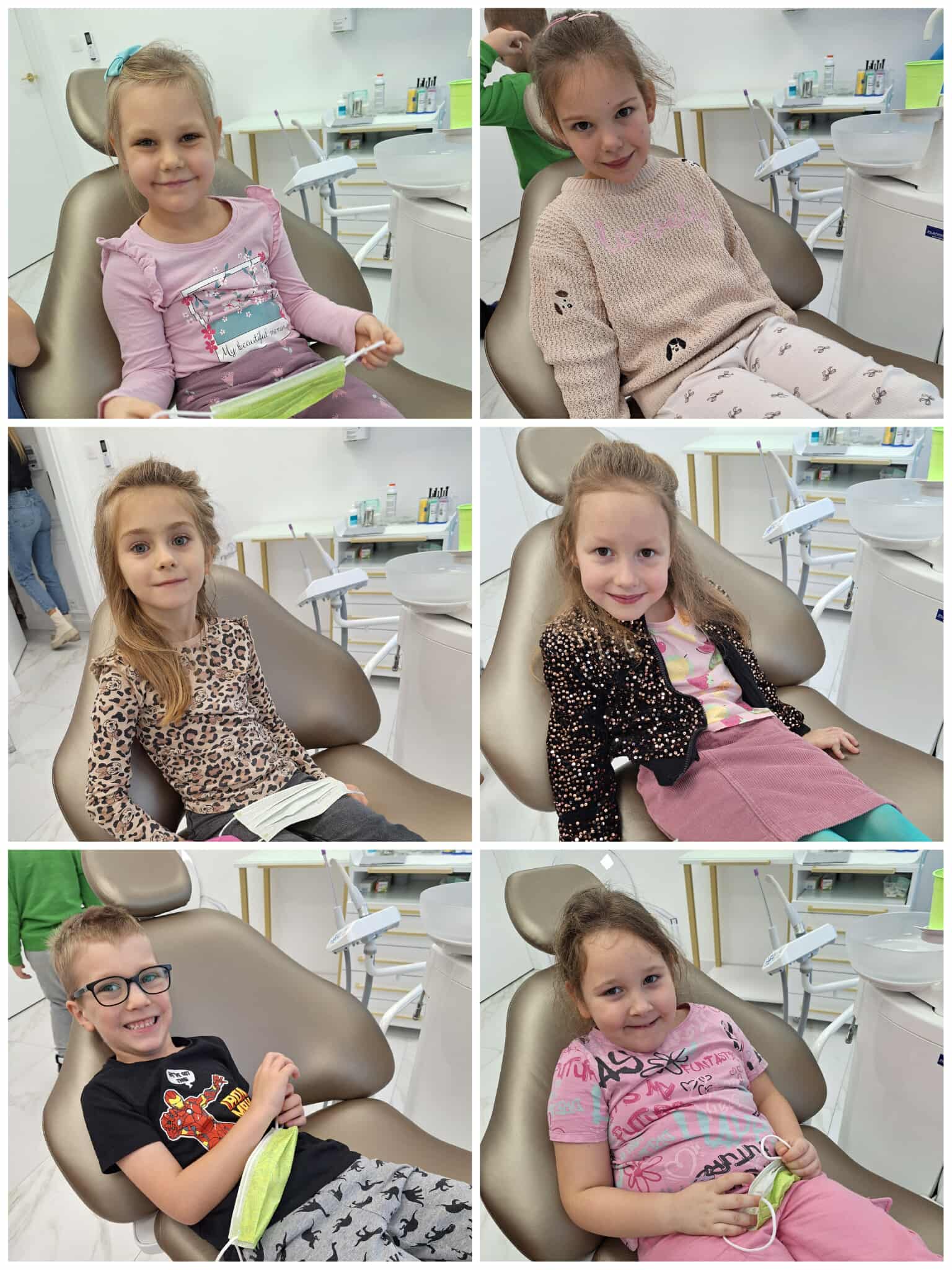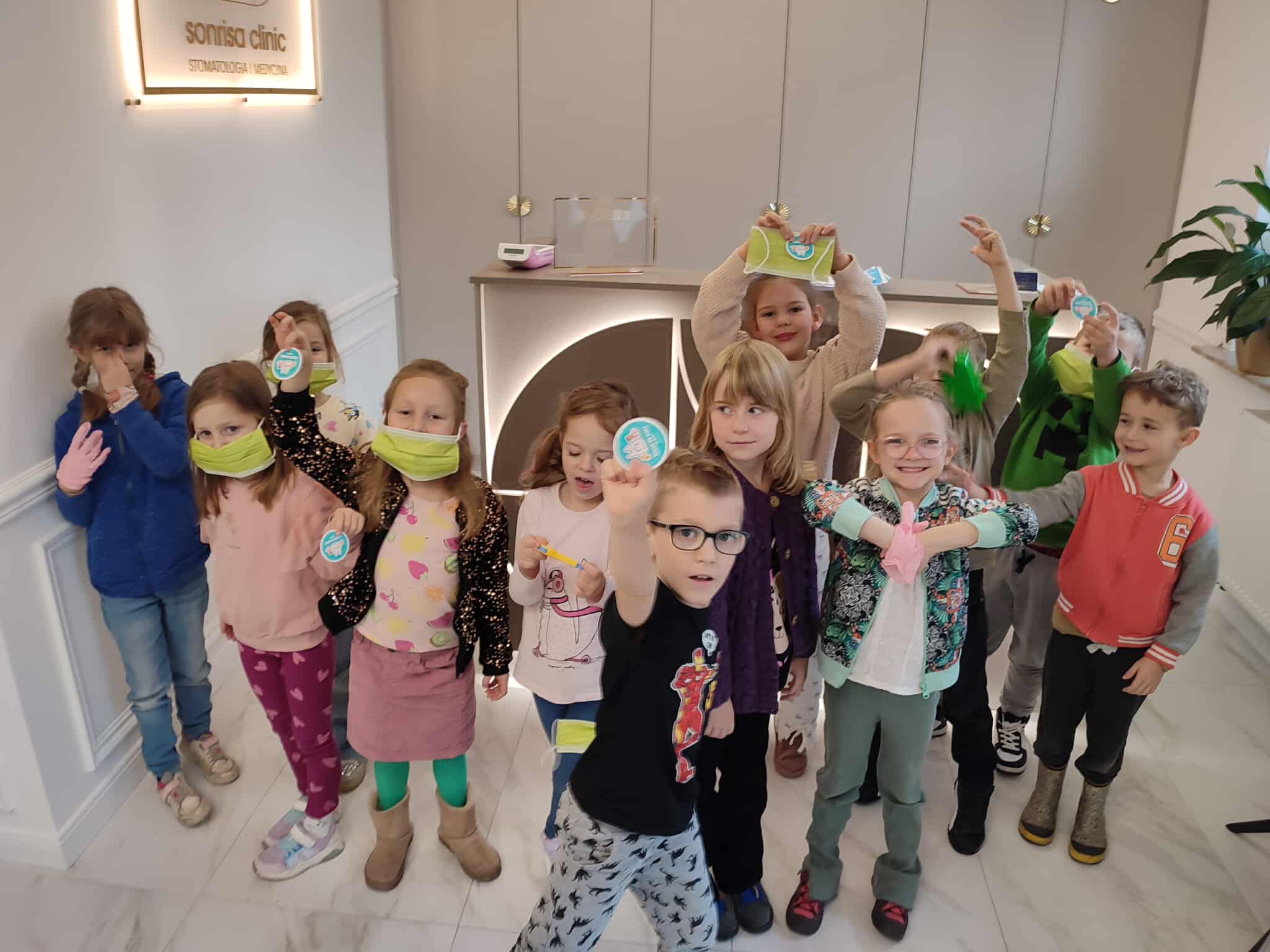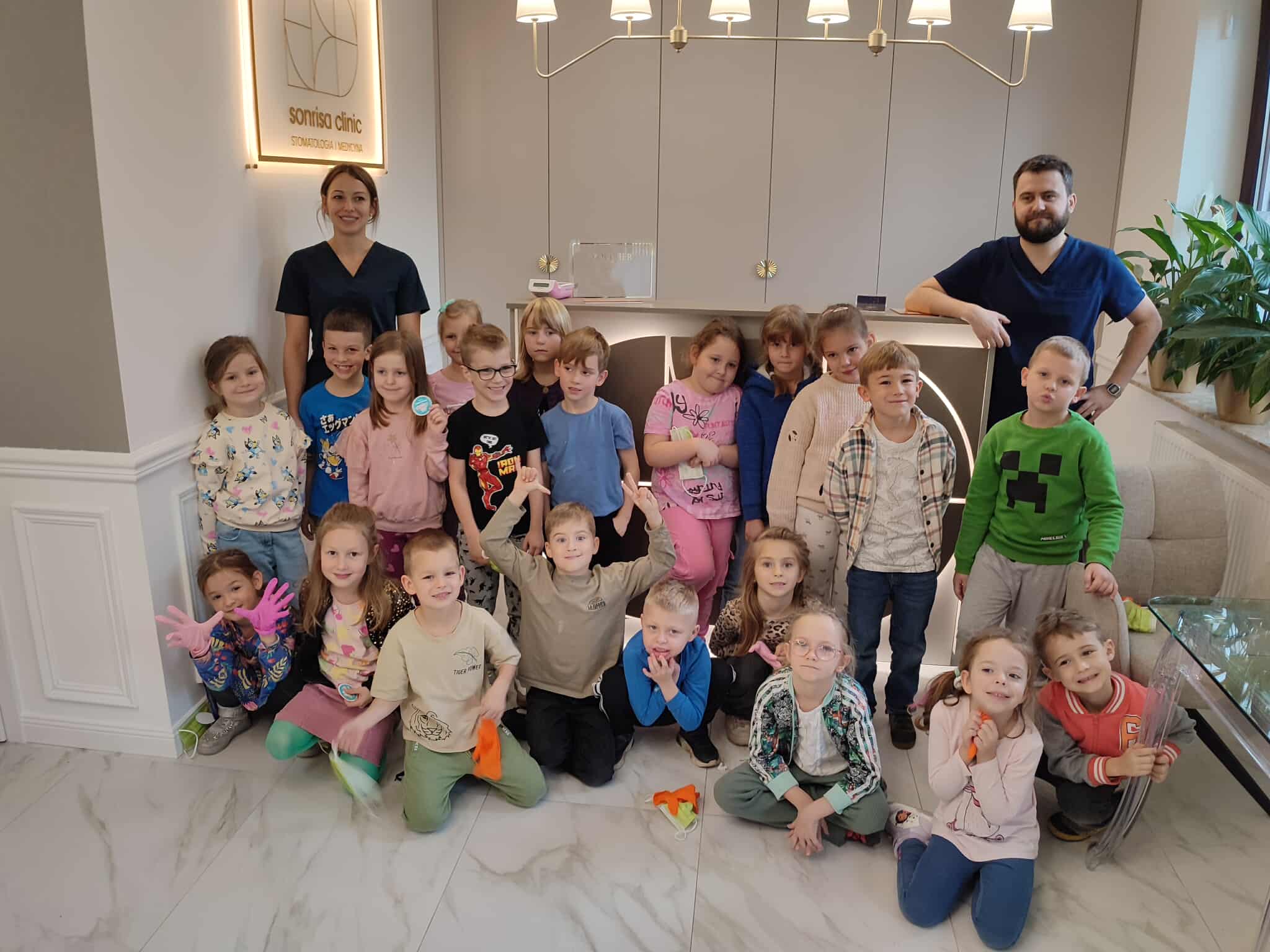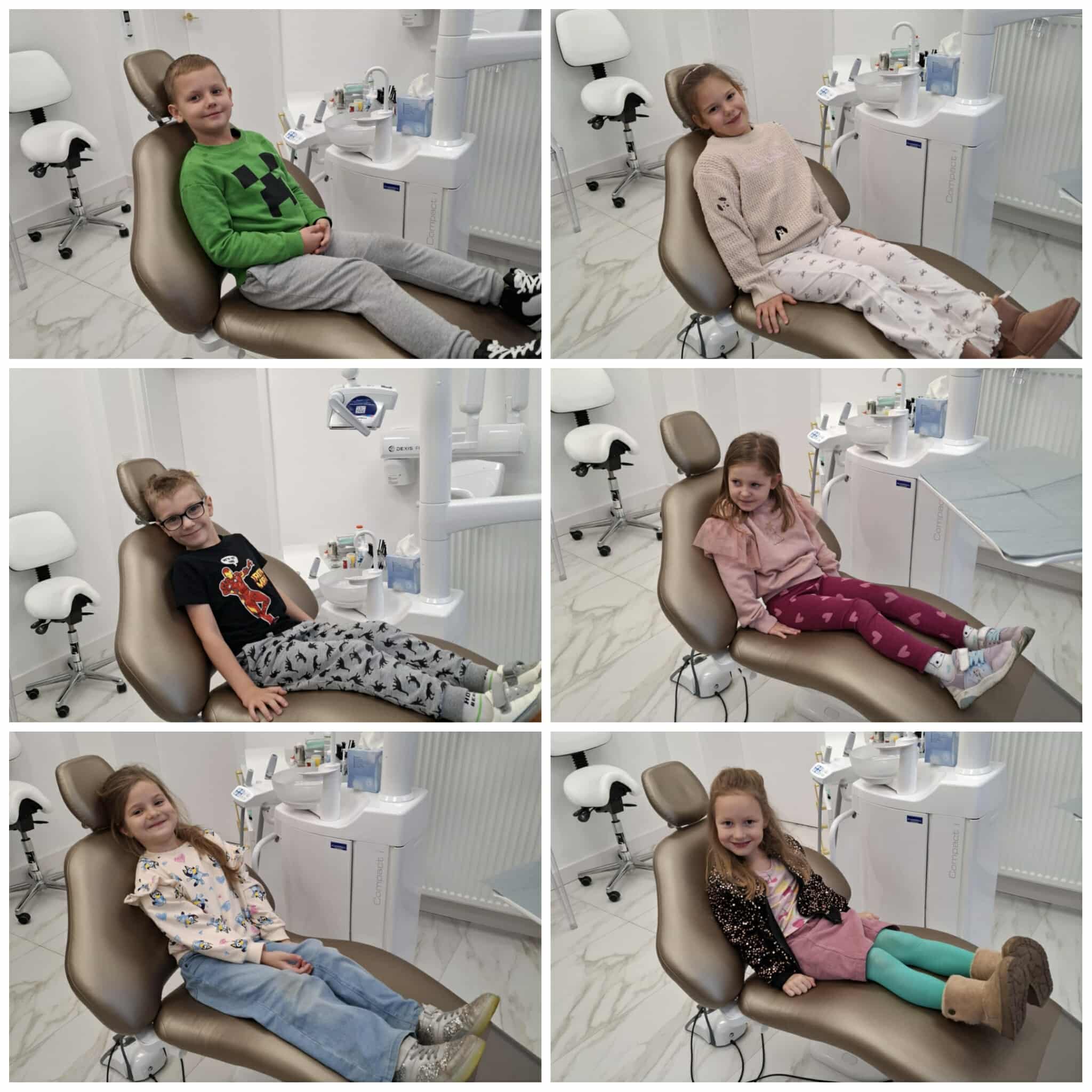 W czwartek wybraliśmy się do gabinetu stomatologicznego – Sonrisa Clinic! Wszystko zorganizowała mama naszego kolegi Kacpra, za co bardzo, bardzo dziękujemy! Dziękujemy też za super gościnę i wspaniałe upominki, które sprawiły nam dużo radości. Na miejscu każdy z nas miał przegląd zębów, a niektórzy także fluoryzację – zupełnie jak dorośli! Była też mini sesja zdjęciowa w maseczkach, rękawiczkach itp. poczuliśmy się jak prawdziwi dentyści! Oprócz tego bawiliśmy się przy kolorowankach i zadaniach, poznaliśmy ciekawe rzeczy o zębach i ich pielęgnacji. To była świetna przygoda i już wiemy, że wizyty u dentysty wcale nie muszą być straszne!
