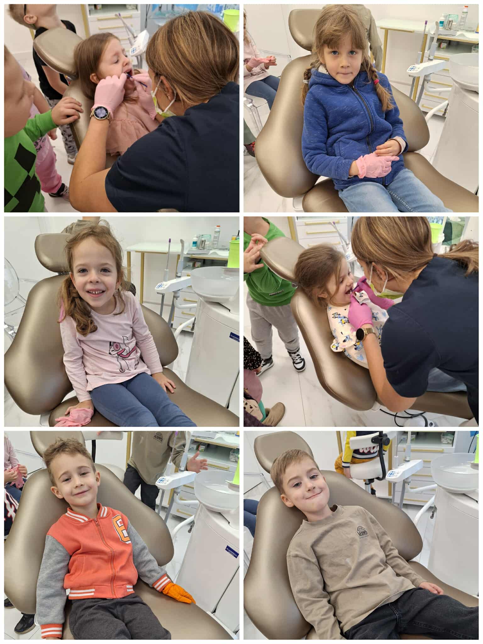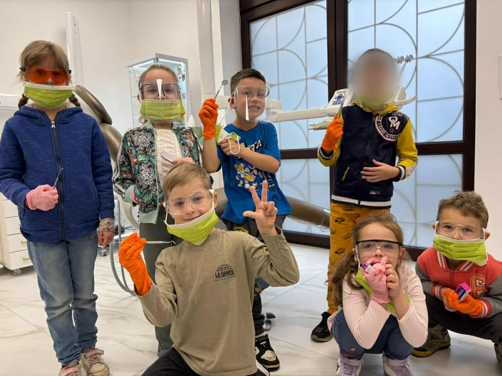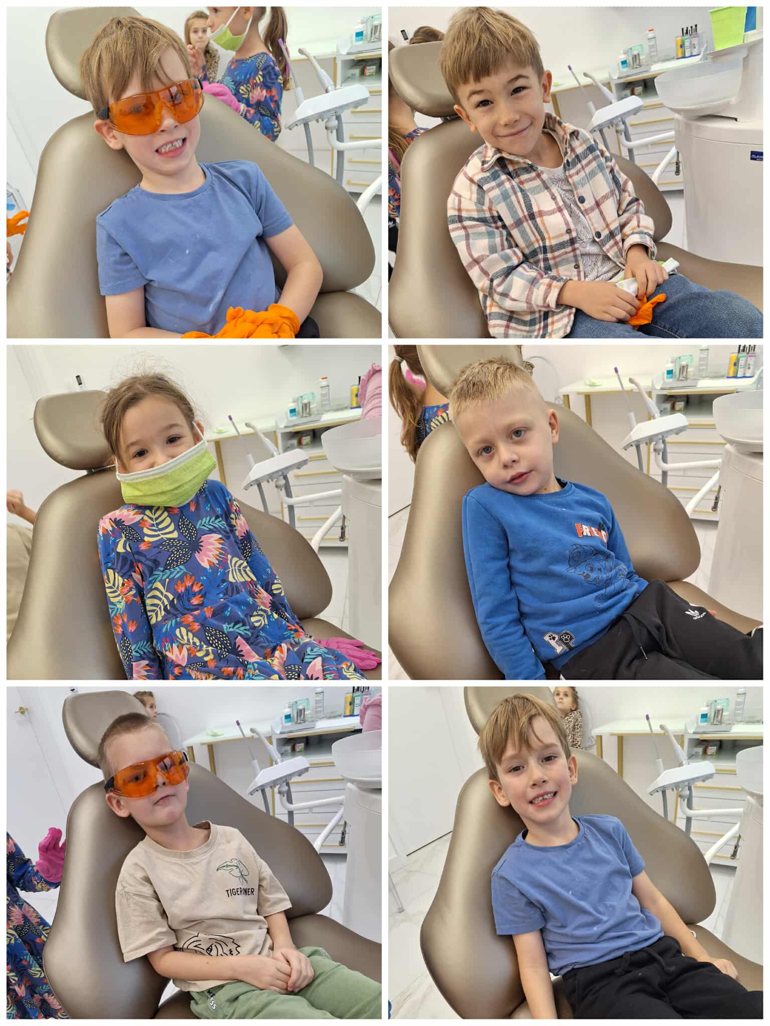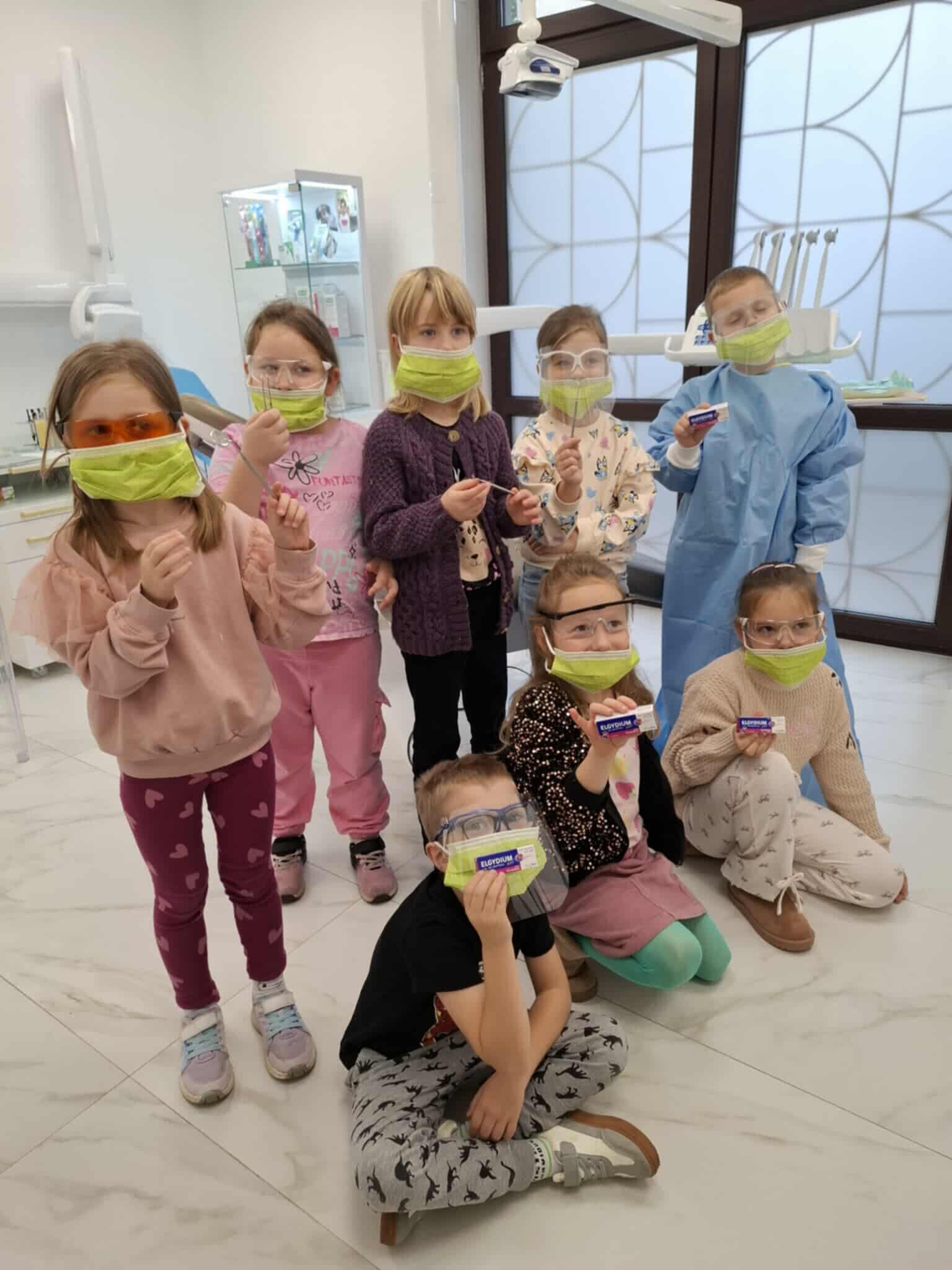W czwartek wybraliśmy się do gabinetu stomatologicznego – Sonrisa Clinic! Wszystko zorganizowała mama naszego kolegi Kacpra, za co bardzo, bardzo dziękujemy! Dziękujemy też za super gościnę i wspaniałe upominki, które sprawiły nam dużo radości. Na miejscu każdy z nas miał przegląd zębów, a niektórzy także fluoryzację – zupełnie jak dorośli! Była też mini sesja zdjęciowa w maseczkach, rękawiczkach itp. poczuliśmy się jak prawdziwi dentyści! Oprócz tego bawiliśmy się przy kolorowankach i zadaniach, poznaliśmy ciekawe rzeczy o zębach i ich pielęgnacji. To była świetna przygoda i już wiemy, że wizyty u dentysty wcale nie muszą być straszne!