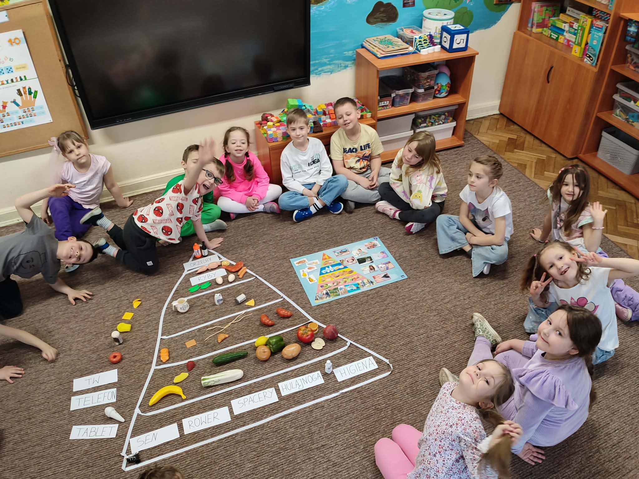 W tym tygodniu rozmawialiśmy o zdrowym stylu życia. Poznawaliśmy różne nawyki, które sprzyjają naszemu zdrowiu i dobremu samopoczuciu. Z zainteresowaniem zapoznaliśmy się również z piramidą żywienia, dowiadując się, jakie produkty warto jeść najczęściej, a które tylko od czasu do czasu.